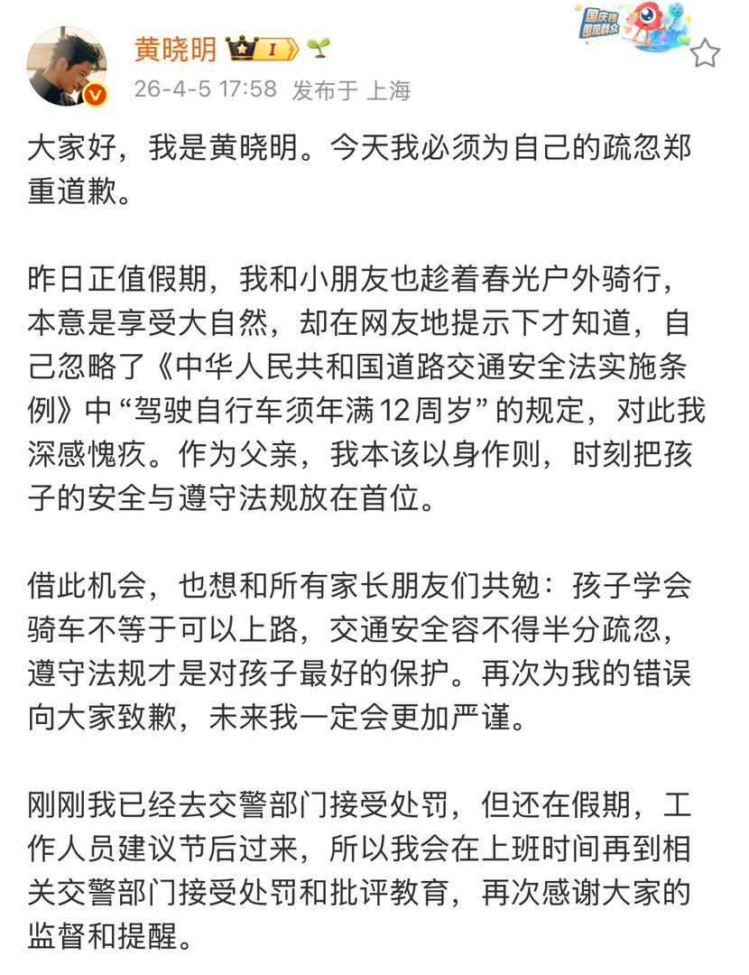 黄晓明就带娃骑行道歉黄晓明已在交警部门接受处罚 4月4日,黄晓明晒与孩子骑车上马路照片,有网友指出此行为违反交规引热议。刚刚,发布道歉声明称:“自己忽略了《中华人民共和国道路交通安全法实施条例》中’驾驶自行车须年满12周岁’的规定,对此我深感愧疚”,并表示目前已前往交警部门,后续将在工作日完成处罚与批评教育,感谢网友的监督与提醒。