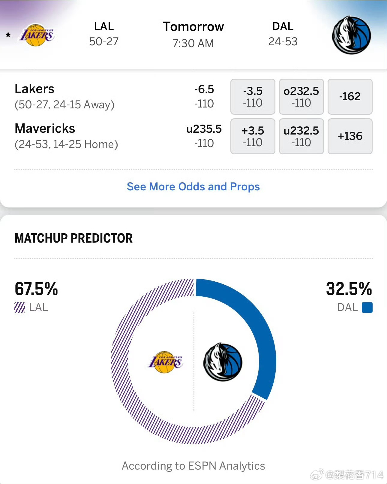 ESPN这次给到湖人胜率高达67.5%,而独行侠胜率只有32.5%,两队本赛季前三次交手,湖人均取得胜利!