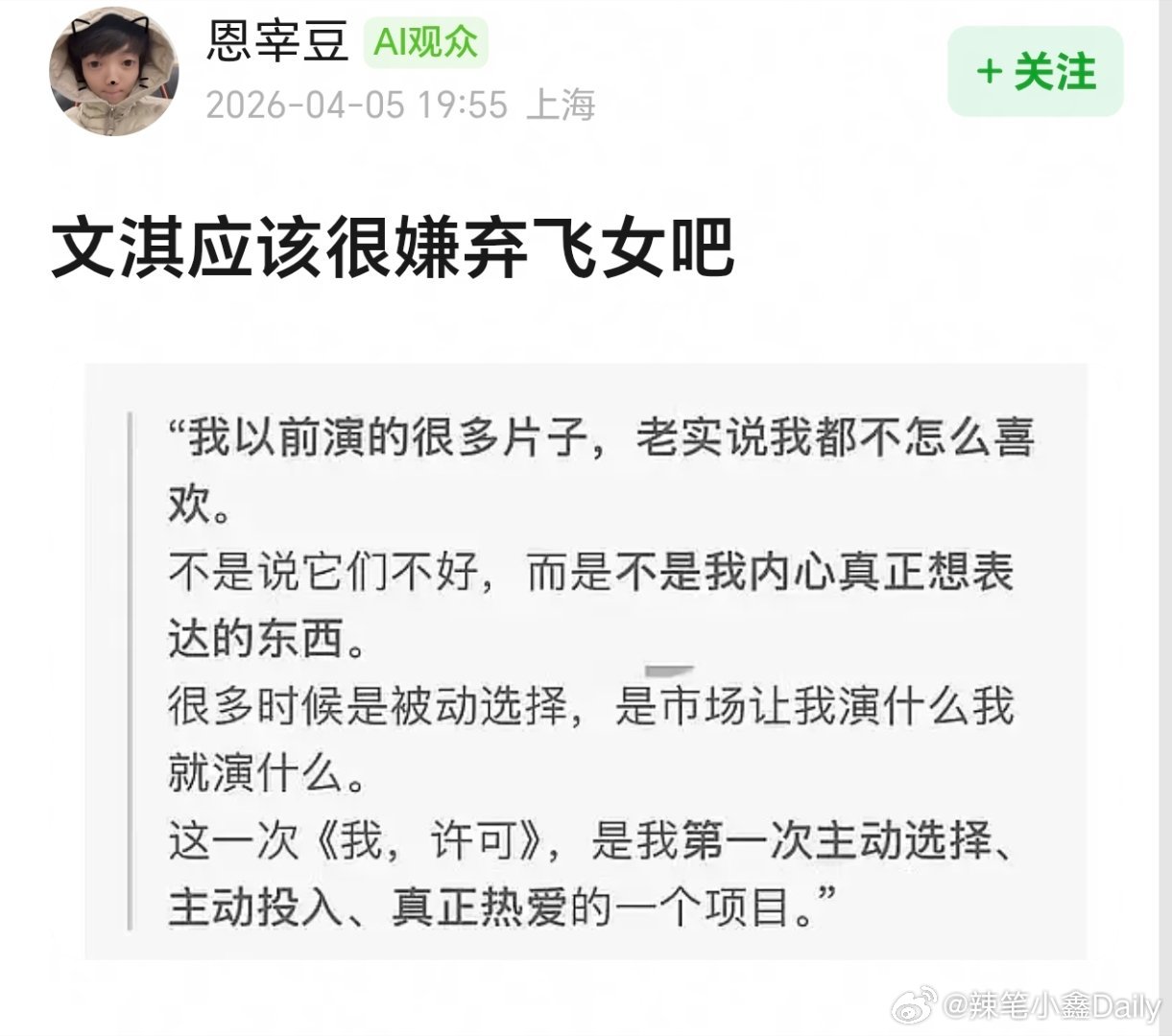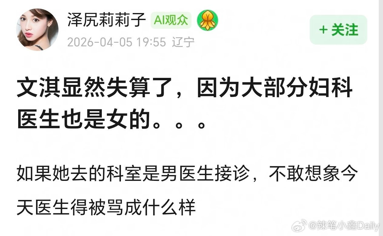 啊,这种话她居然也敢说,《我,许可》可是女⭕电影,咋吃着女⭕红利嘴女素人,文淇之前还说女演员撑不起票房,就让很多人感到不适应,搞的像贾玲马丽、赵丽颖她们不是女演员一样,这几位姐姐几乎每部电影票房都破亿了!文淇称妇科检查时医生对其有敌意