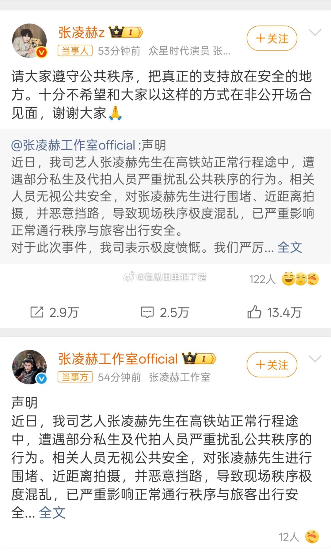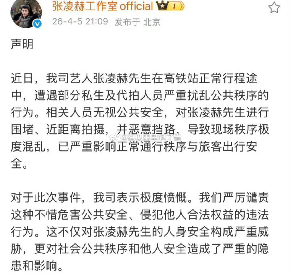 张凌赫工作室郑重声明张凌赫工作室发布声明,坚决抵制ss和代拍 !张凌赫本人也⭕发了