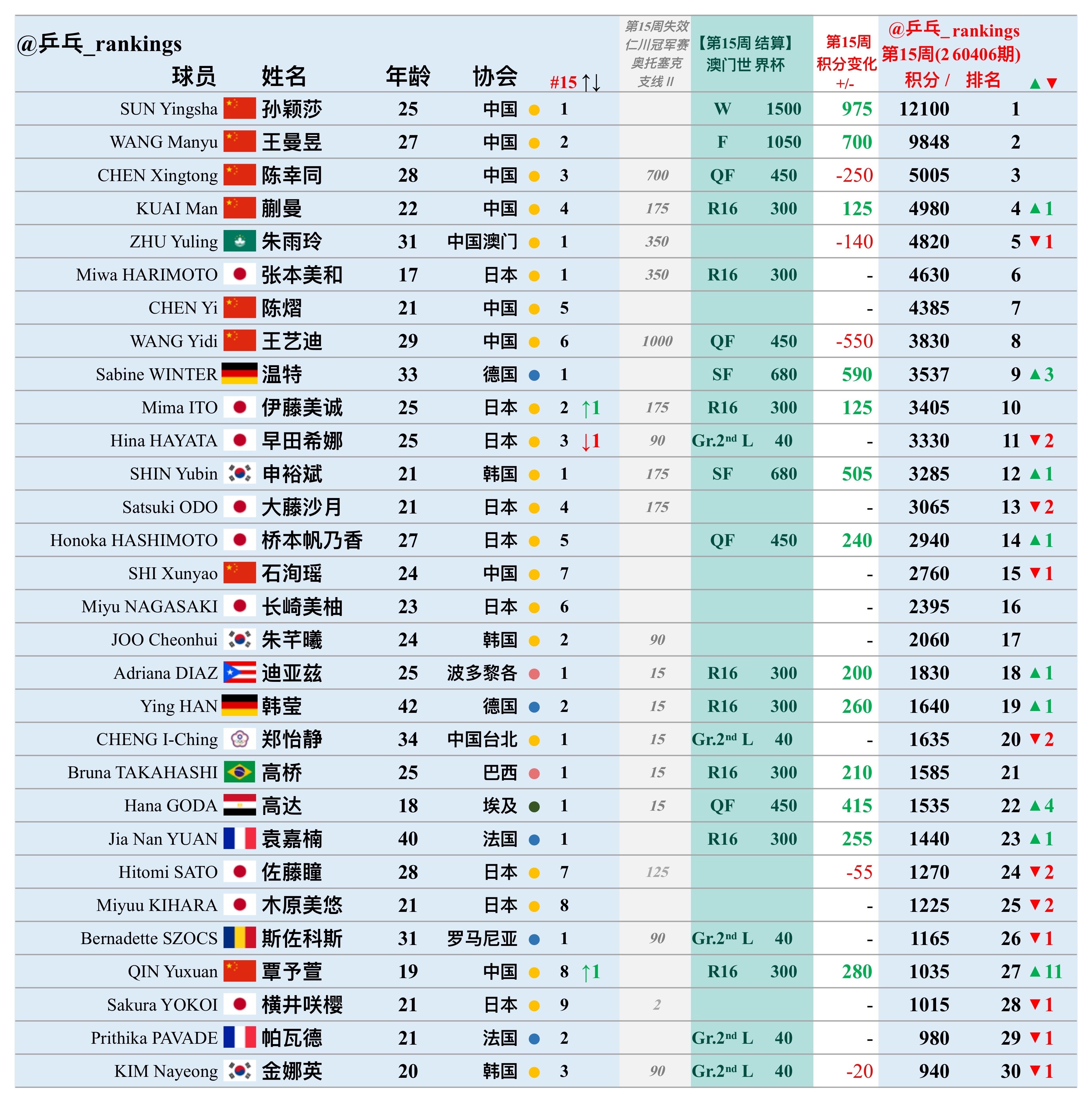 第15周世排积分变化(20260406期)【女单】🔺本周结算• 2026澳门世界杯🔻本周失效• WTT仁川冠军赛2025• WTT奥托塞克支线Ⅱ 2025