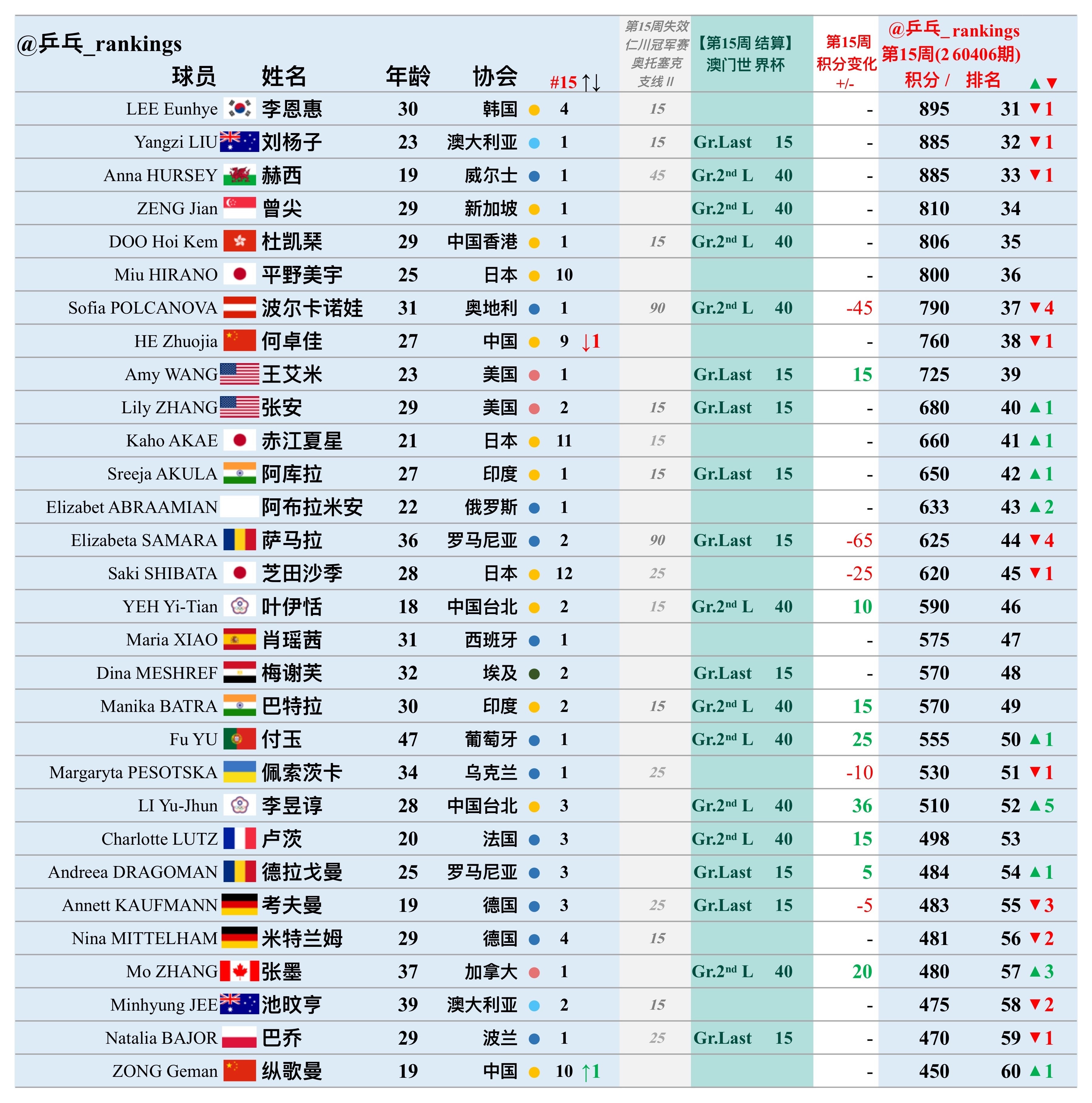 第15周世排积分变化(20260406期)【女单】🔺本周结算• 2026澳门世