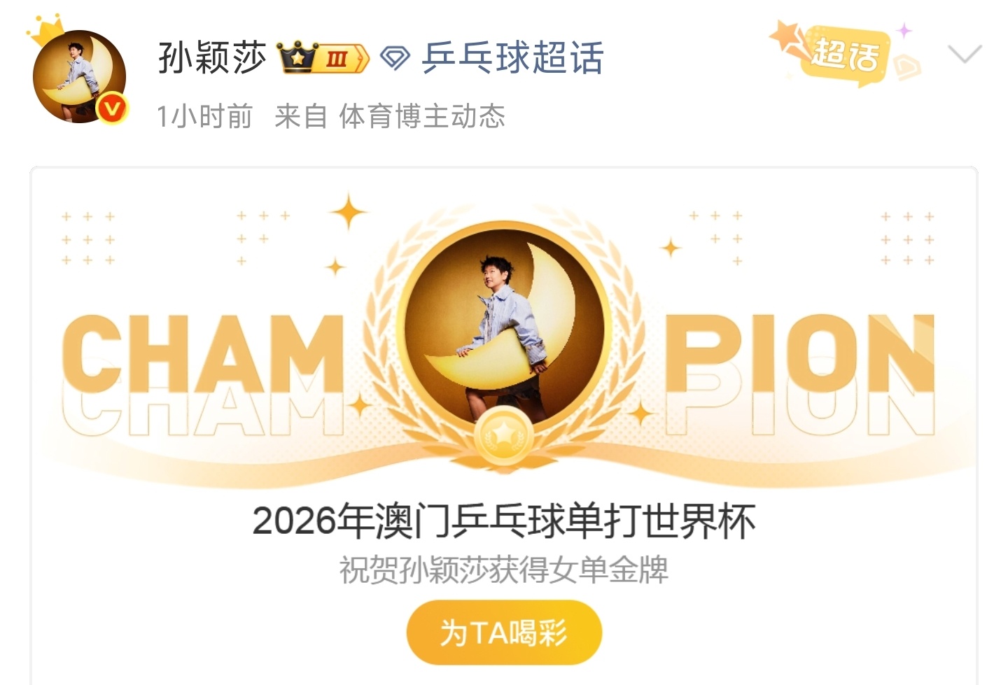 孙颖莎被球迷喊害羞了太可爱了恭喜莎莎!在2026澳门乒乓球世界杯女单决赛中,以4-1战胜王曼昱,成为赛事创办以来首位实现女单三连冠的选手,再创历史!🏆