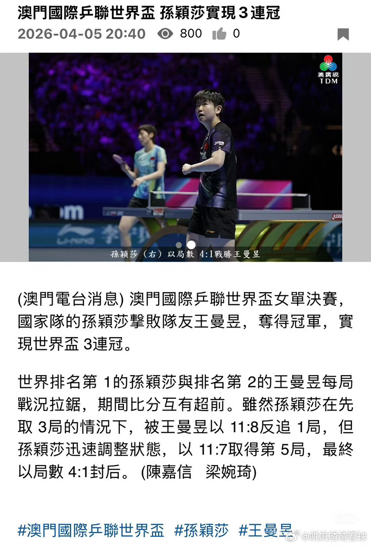 澳门媒体王楚钦孙颖莎称王封后称王封后,他俩都受得起!