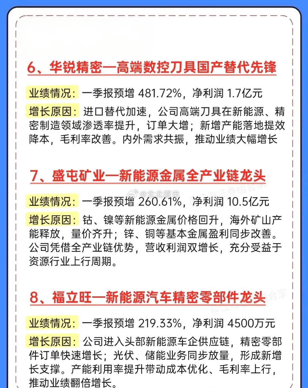 一季报大爆发!10家业绩暴增龙头全梳理,最高狂涨5021%!一季报行情正式打响!这份超预期增长名单直接封神,10家公司业绩集体炸裂,最高同比暴增超5000%,覆盖存储芯片、高端刀具、新能源、医药等多个高景气赛道,每一家都藏着业绩爆发的核心逻辑!德明利以5021.28%的增速一骑绝尘,存储芯片国产替代+AI算力需求双轮驱动,子公司股权出售更是给业绩添了一把火;富祥药业、欧科亿紧随其后,2700%+、2500%+的增速,分别在CDMO、数控刀具赛道实现国产替代与订单爆发。从万邦德的铝加工+医药双轮驱动,到新锐股份、华锐精密的刀具国产替代浪潮;从盛屯矿业的新能源金属周期上行,到福立旺的新能源车零部件放量;从奥来德的OLED+钙钛矿双赛道共振,到博汇股份的环保芳烃油复苏,每一家都踩中了行业景气度的风口。投资收益、主业复苏、国产替代、周期上行,多重利好共振下,这些一季报超预期的公司,正是当下市场最具确定性的方向。⚠️ 风险提示:以上内容仅为信息整理,不构成任何投资建议,股市有风险,入市需谨慎。