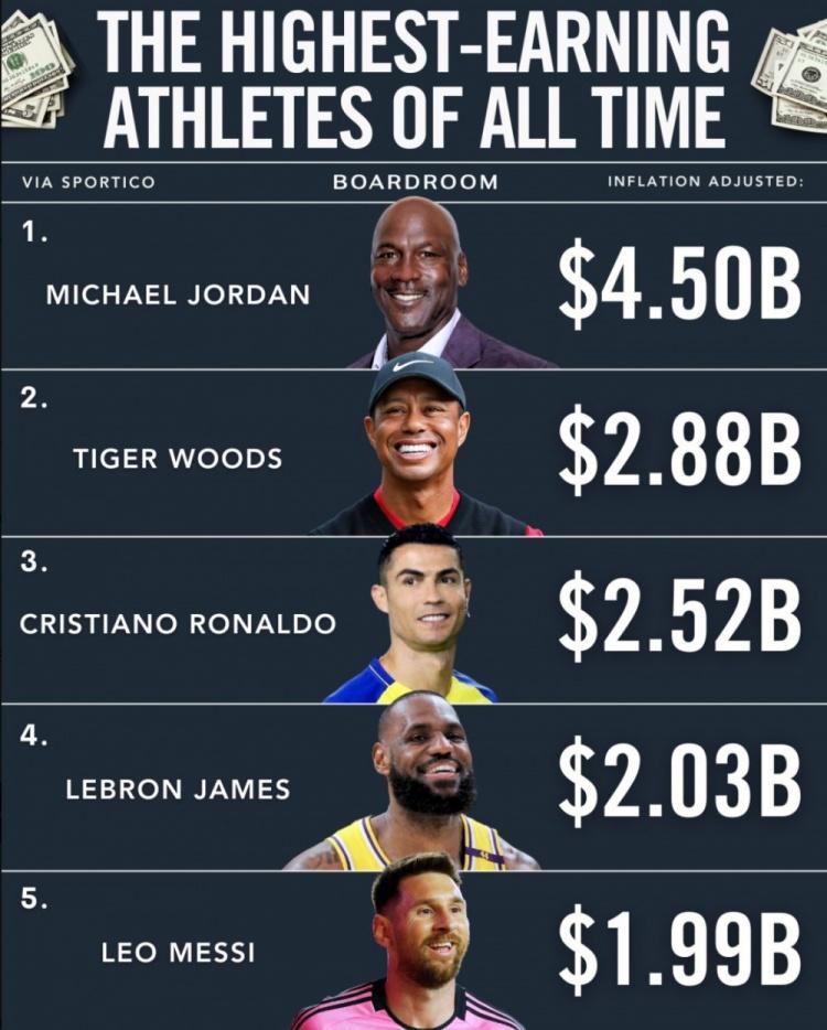 史上收入最高运动员: 1、乔丹——45亿美元 2、伍兹——28.8亿 3、C罗——25.2亿 4、詹姆斯——20.3亿 5、梅西——19.9亿 这是体育商业媒体Sportico公布的最新数据,但这个数据并非得到所有人的认可,此前收入稳压詹姆斯的魔术师,这一次只排到了第36位,收入7亿美元。 这些排名中,只有乔丹一人永远是体育运动员收入第一,且多年没变、断档领先。一个乔丹品牌的分红,每年就能带来几亿美元的收入,远比其他运动员的薪水和代言来的更多。 或许10年以后,C罗的商业发展能稍微往上追赶一些,但想要和乔丹达到同一水平线,还是太难了。