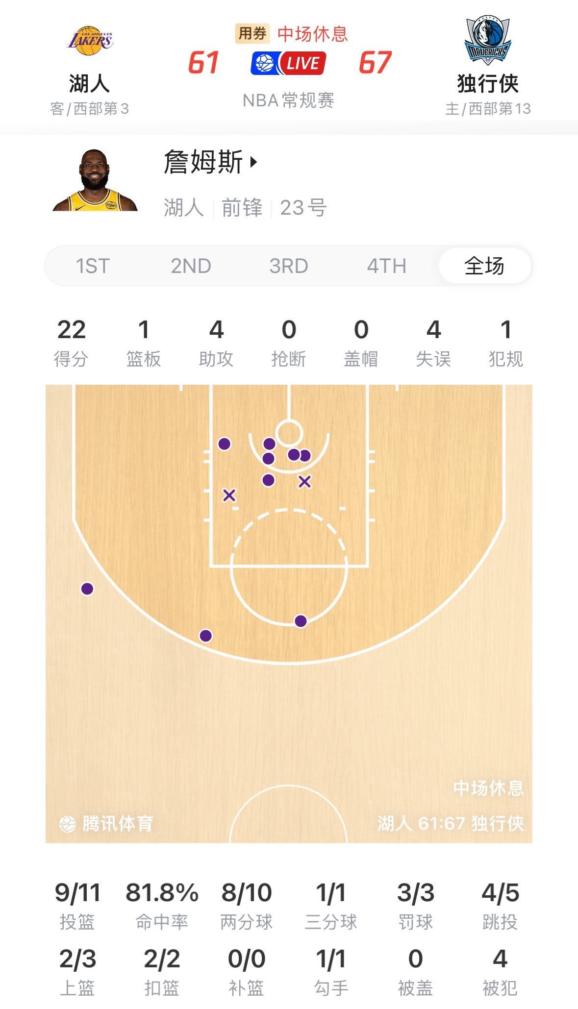 詹姆斯半场11投9中,三分1中1,得到22分1板4助攻。真不容易了! 湖人vs独行侠
