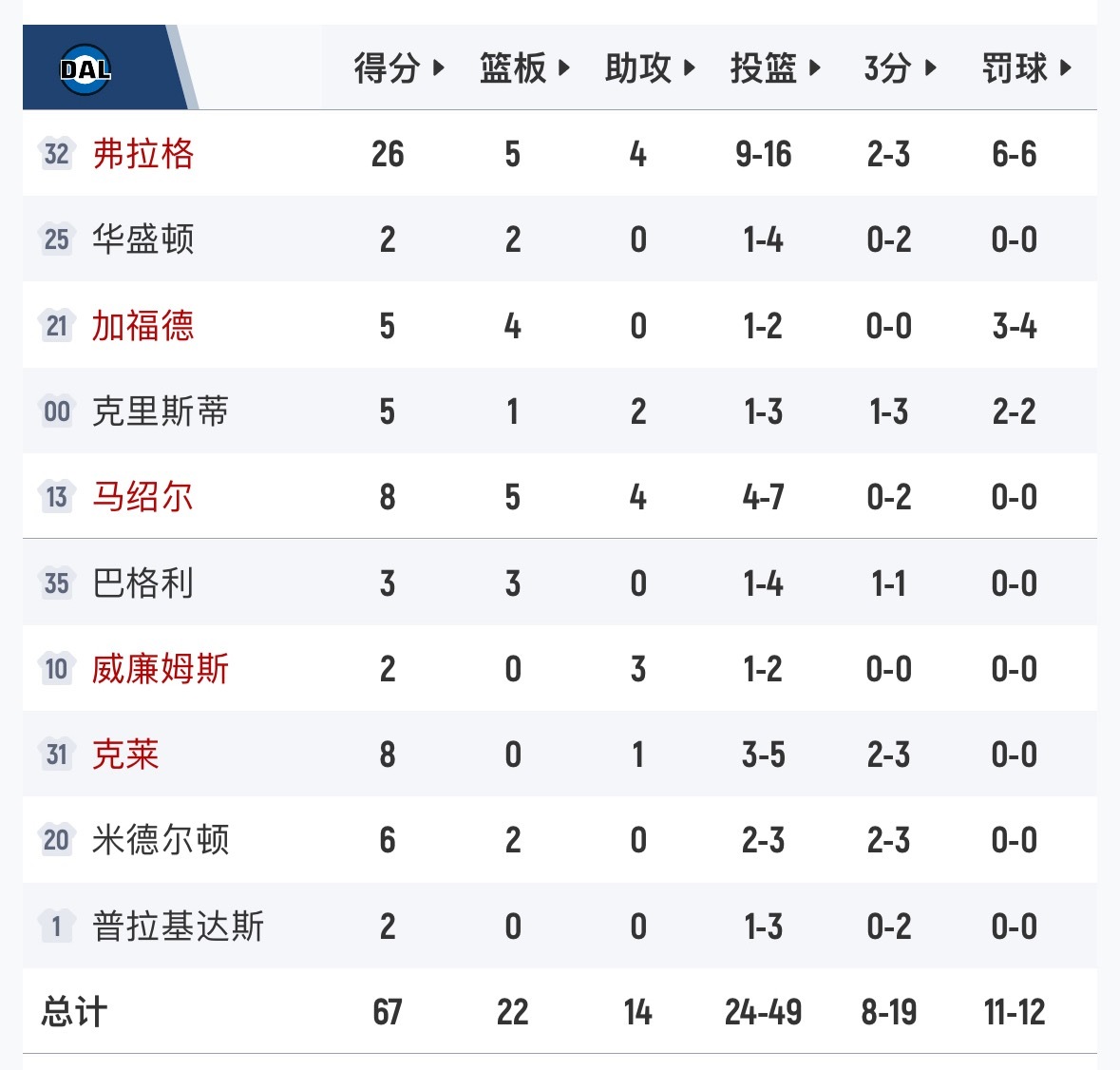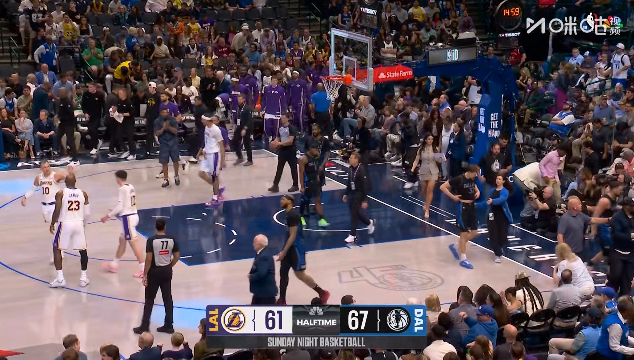 拉哥没中 湖人半场61-67独行侠。湖人vs独行侠