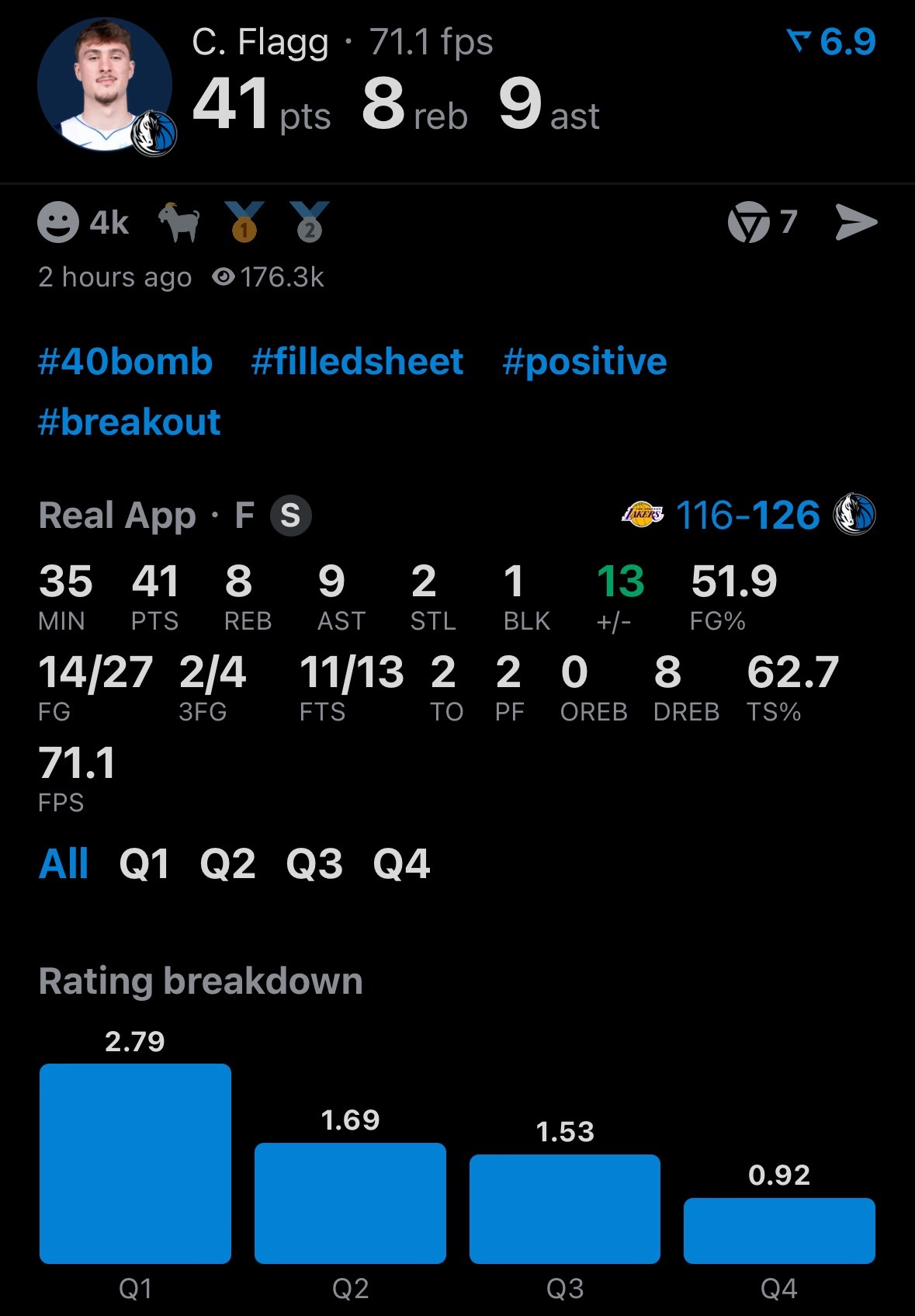 走远了,弗拉格41分8板9助攻。湖人vs独行侠