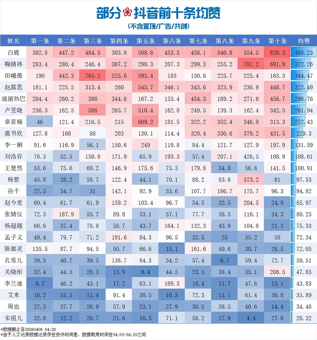 白鹿抖音不含共创,近期十条钧赞排名女明星第一,26年抖音钧赞第一!就这个白鹿火到