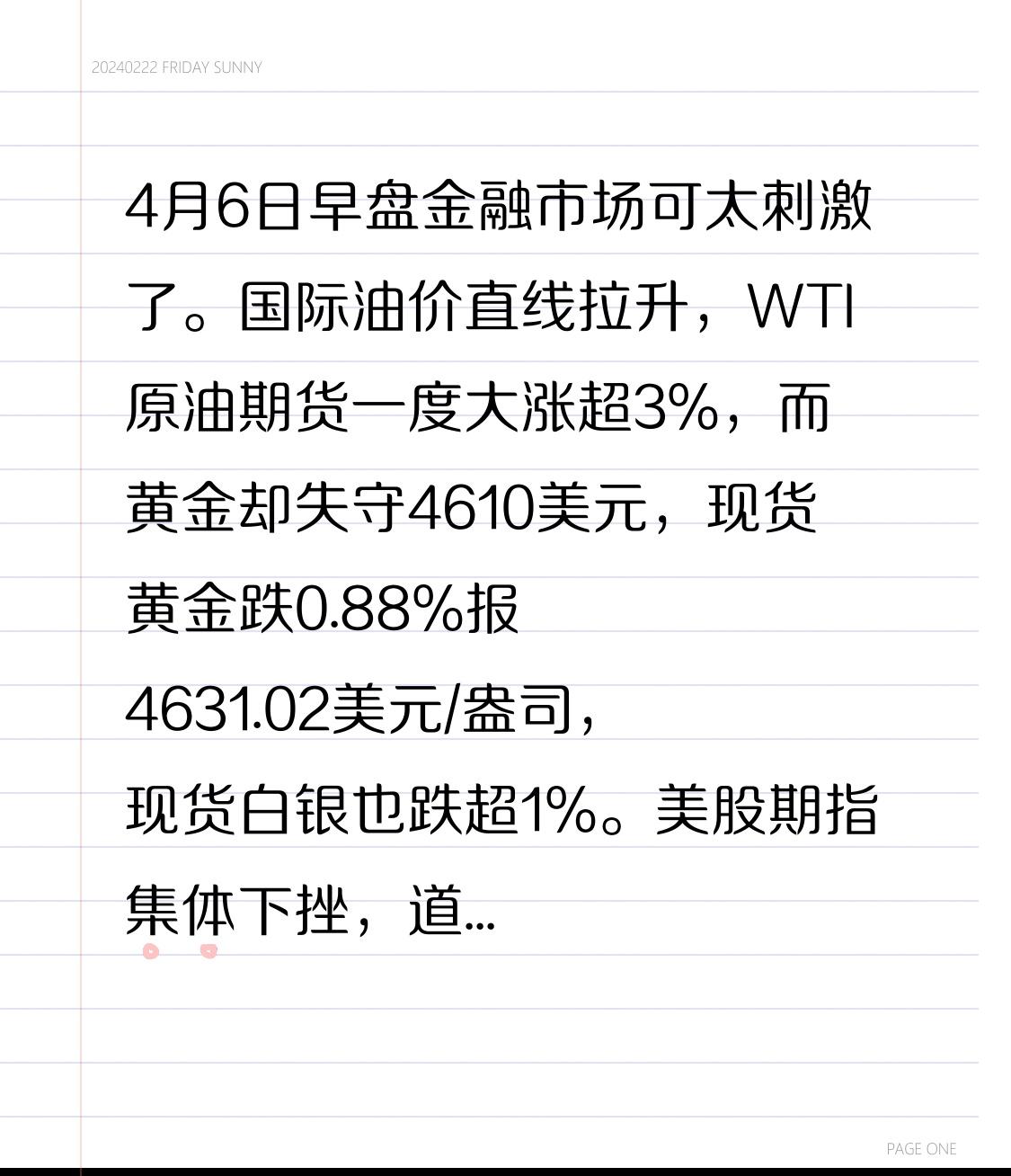 4月6日早盘金融市场可太刺激了。国际油价直线拉升,WTI原油期货一度大涨超3%,而黄金却失守4610美元,现货黄金跌0.88%报4631.02美元/盎司,现货白银也跌超1%。美股期指集体下挫,道琼斯指数期货跌0.32%,标普500指数期货跌0.26%,纳斯达克100指数期货跌0.21%。 这背后可能和特朗普的言论有关,他推迟摧毁伊朗能源设施行动的时限,还暗示要轰炸伊朗发电厂和大桥,伊朗则重申封锁霍尔木兹海峡。这局势一紧张,市场就跟着波动,投资者可得多留意了。 原油市场行情 国外金价 原油行情解读 黄金早盘跳水 重质原油价格 金价油价 美油行情