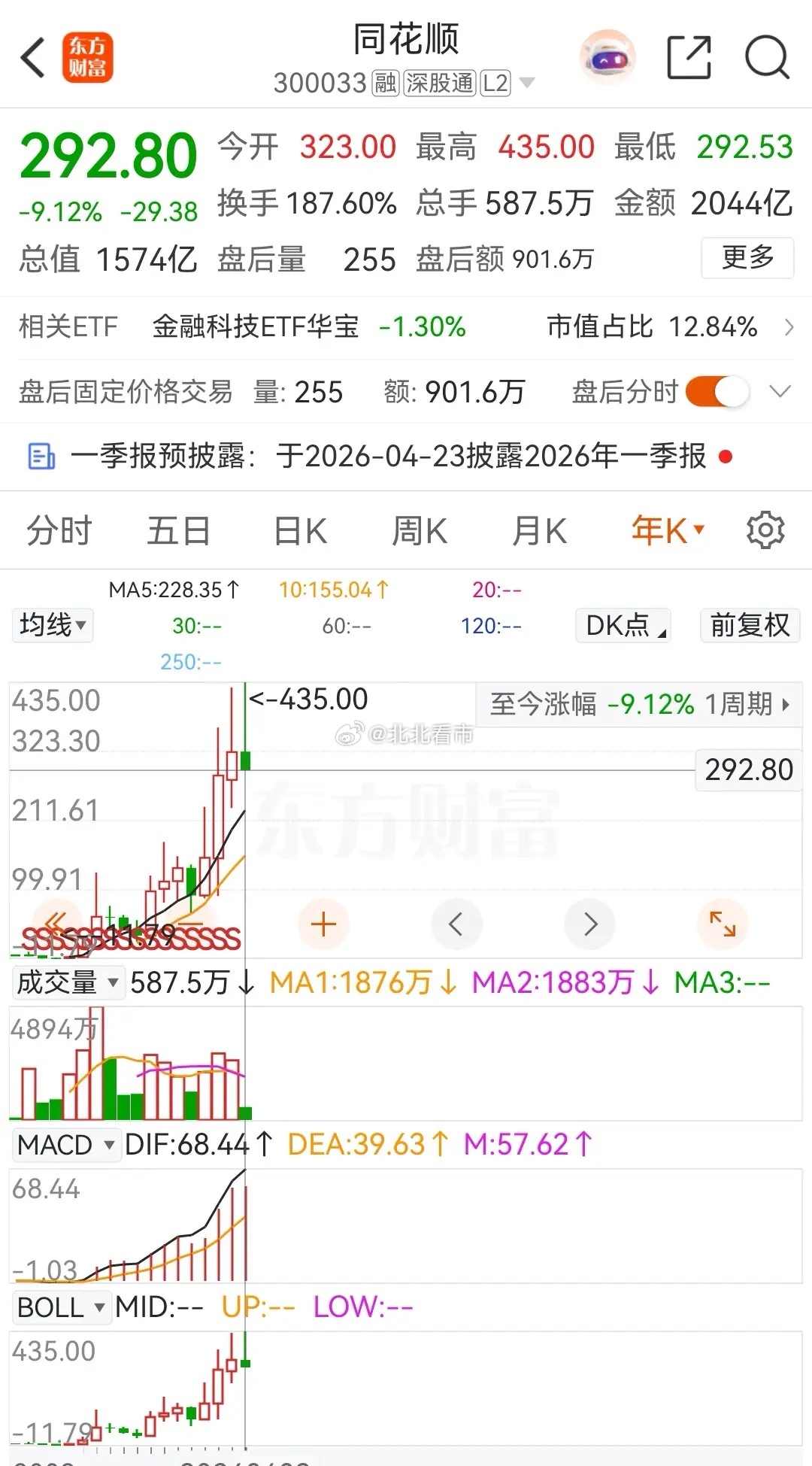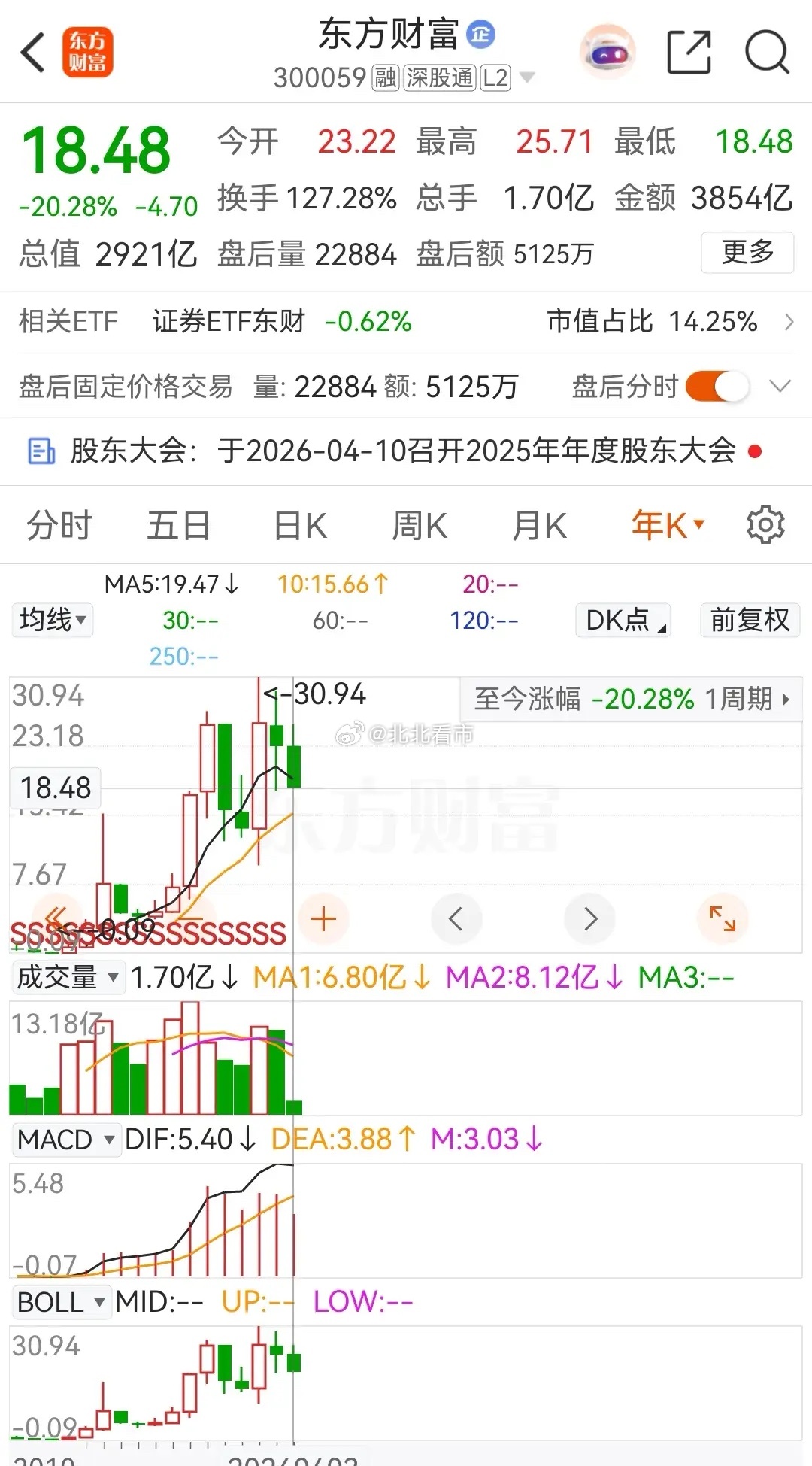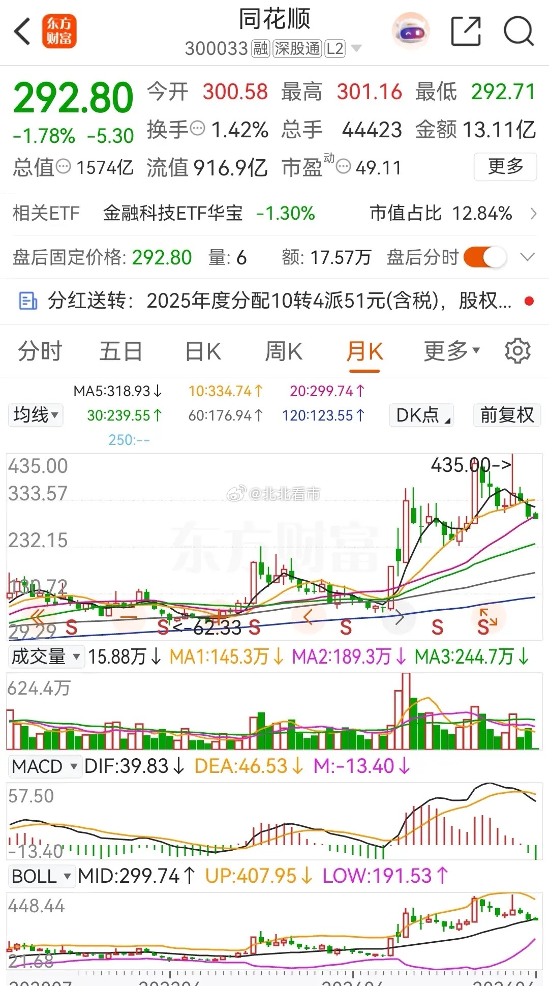 同花顺当前的报价为292.80元,当前总市值为1574亿元。从走势上看,目前同样也是处于破位下行态势之中。在业绩方面,在2025年公司实现收入为60.29亿元,同比增长44.00%;归母净利润32.05亿元,同比增长75.79%;扣非归母净利润30.51亿元,同比增长72.87%。利润分派方面,公司每10股派发现金51元(含税),预计总派发金额为27.42亿元,并以资本公积金每10股转增4股,不送红股。