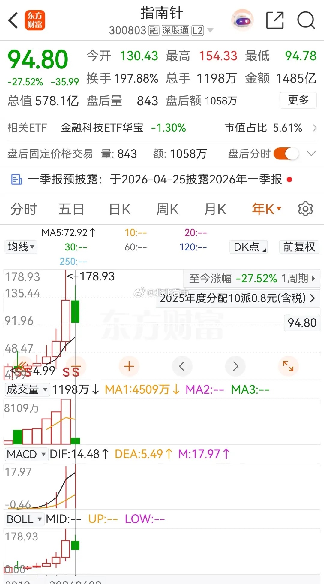 指南针当前的报价为94.80元,总市值约为578.1亿元。从走势上看,正处于标准的下行态势之中。在业绩方面,2025年公司实现营业收入21.46亿元,同比增长40.39%;归母利润2.28亿元,同比增长118.74%;扣非归母净利润1.72亿元,同比增长78.42%。在利润分派方面,每10股派发现金红利0.8元(含税),已经派发完成。