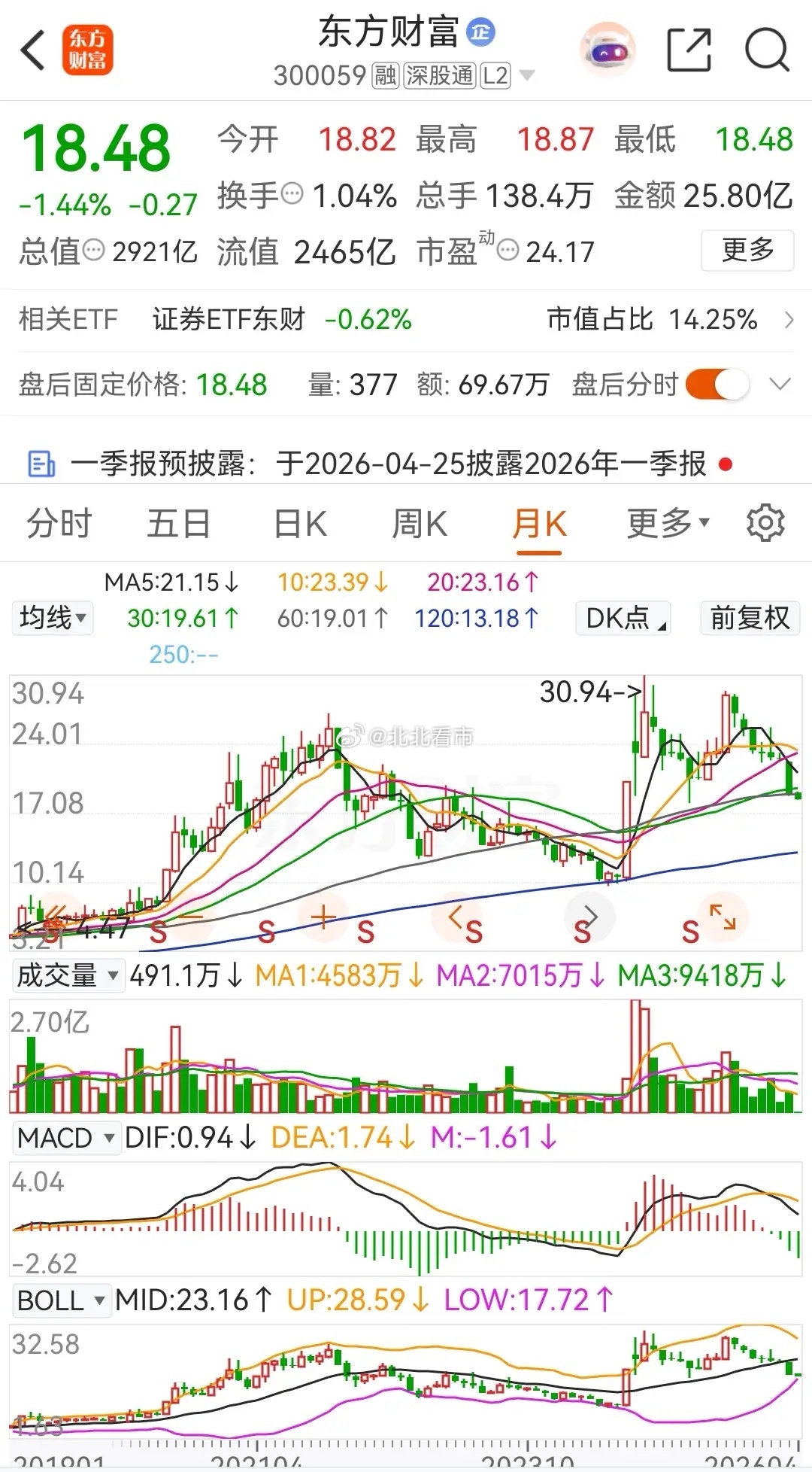 东方财富当前报价为18.48元,总市值为2921亿元。从走势上看,整体处于破位下行态势之中,目前月线更是连续八个月收阴。业绩方面,2025年全年公司实现营业总收入为160.68亿元,同比增长了38.46%;实现归母净利润为120.85亿元,同比增长了25.75%。在利润分派方面,每10股派发现金1元(含税),预计分派现金15.80亿元。