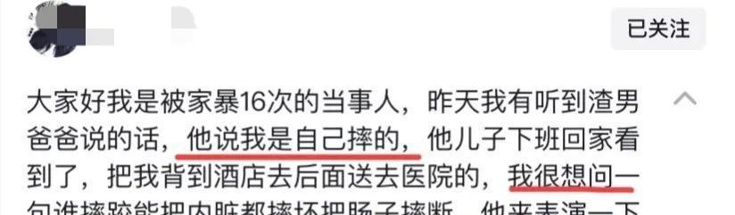 29岁女子肠断703宾馆:丈夫16度空调下踢碎肋骨,婆家五粮液摆平派出所,孩子画里父母手牵手她却挂着人造肛袋 那间宾馆703房的空调,永远定格在16度。冷风像刀子一样钻进骨髓时,她躺在地板上,听见自己肋骨断裂的脆响。不是电影里的特效音,而是胸腔里实实在在的、令人牙酸的碎裂声。肠子断成两截的剧痛让她意识模糊,但比剧痛更冷的,是丈夫贺某阳转身离开的背影。八个小时,血慢慢浸透地毯,体温随着空调冷气一点点流失。 送到医院抢救室时,她的脉搏已经停了。心电监护仪上那根直线,足足闪了七分钟。医生剪开衣服时,麻醉师都不忍直视。十二指肠全部切除,人造肛袋将伴随她的余生。一口水都反胃,走路必须扶墙,29岁的身体仿佛一具被撕碎又勉强缝补的布偶。而伤害她的人,此刻在哪里? 在派出所隔壁的茶楼里。监控清晰拍下,贺某阳的表哥拎着两瓶五粮液,谈笑风生地走进去。这不是第一次“摆平”。早在4月15日,贺某阳就曾在陶德砂锅店,将滚烫的砂锅整个浇在她背上。汤汁溅地“滋”起白烟,周围食客惊恐四散,而施暴者扬长而去。暴力,从来不是偶然,而是一场被纵容的狂欢。 更令人心寒的是婆家的反应。贺某阳的父亲面对镜头,面无表情地说:“她自己摔的。”律师打电话威胁:“签了谅解书,你妈还能好好活着。”每一句话,都像一把盐,撒在尚未结痂的伤口上。他们试图用权势、谎言和威胁,将一场残忍的故意伤害,扭曲成轻飘飘的“家庭纠纷”。 她躺在病床上,已经流不出眼泪。但每天早晨七点,手机屏幕会准时亮起——幼儿园发来孩子的视频。小家伙举着蜡笔画,上面歪歪扭扭画着“爸爸妈妈手拉手”。那个充满爱意的童话世界,与703房的冰冷地狱,形成了撕裂灵魂的对比。孩子笔下的团圆,成了母亲现实中无法触及的奢望。 这不是一个简单的家暴故事。这是一个关于人性之恶如何在冷漠与包庇中滋生的样本。当施暴者用五粮液“开路”,当至亲之人用谎言“遮羞”,当正义的通道可能被特权与关系堵塞,每一个旁观者都能感到刺骨的寒意。它叩问着我们:面对如此赤裸的恶,社会的保护网究竟在哪里? 她的故事,撕开了某些“家庭内部事”的遮羞布。暴力就是暴力,犯罪就是犯罪,不应因一纸婚书而打折。每一次沉默和纵容,都是对施暴者的无声鼓励。我们需要的不只是对受害者的同情,更是对系统漏洞的追问和对公正执法的坚定呼唤。 今天,她挂着肛袋艰难求生;明天,还有多少“她”在看不见的角落绝望?孩子的蜡笔画应该描绘幸福,而不是成为母亲血泪的讽刺注脚。当我们为这个29岁的女子呐喊时,也是在守护无数个可能遭遇同样命运的无辜者。她的战斗,必须也是我们的战斗。 家暴零容忍 司法公正 女性安全 (来源:根据媒体报道及网络信息综合撰写)