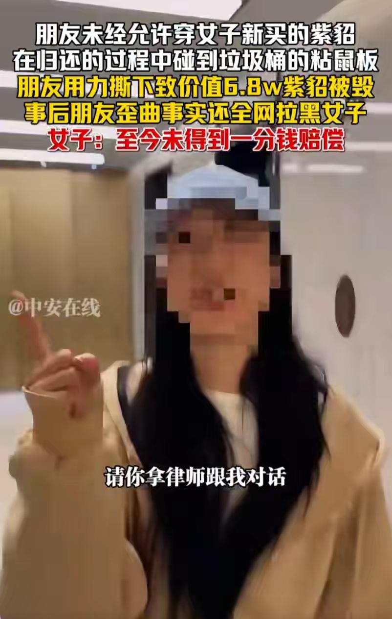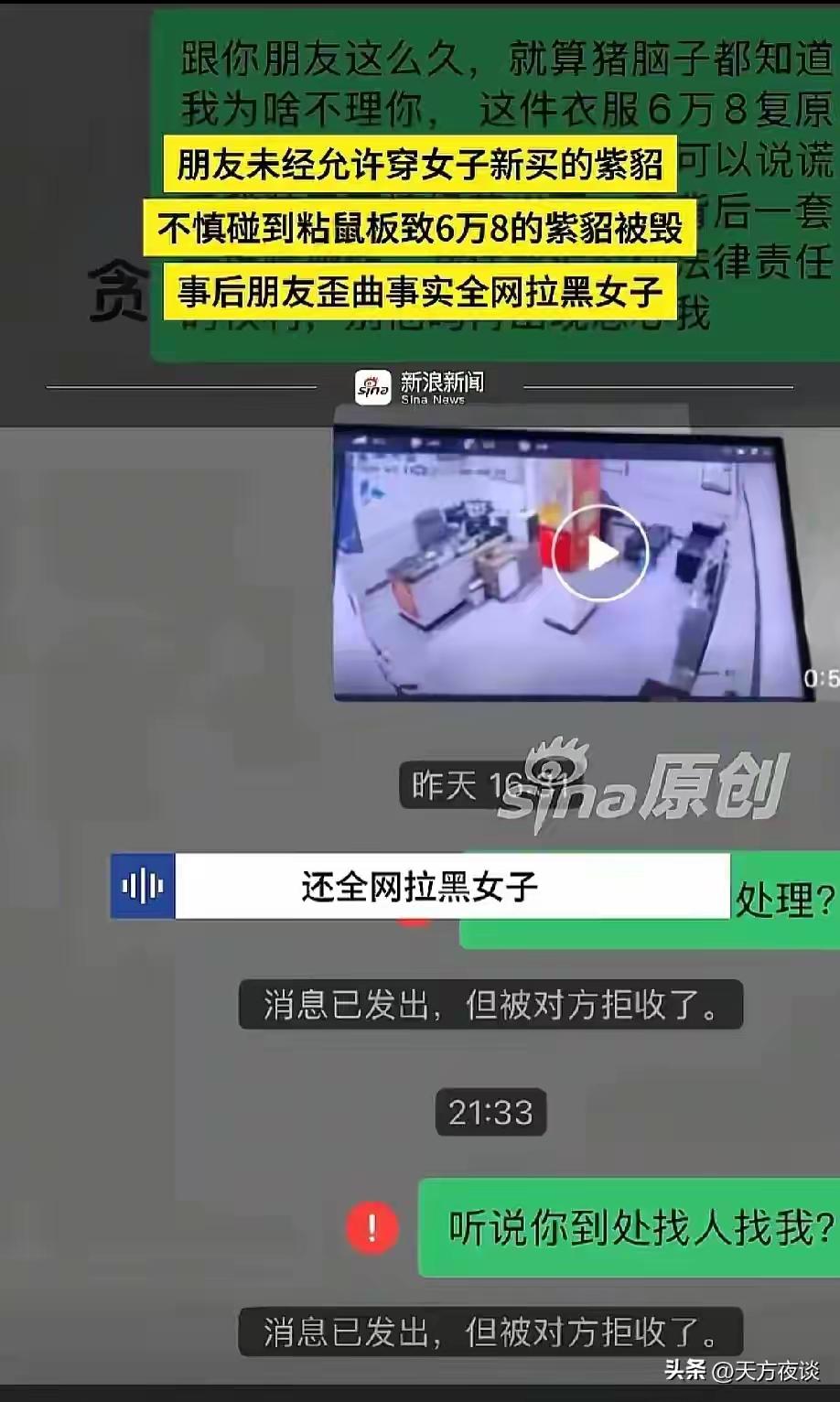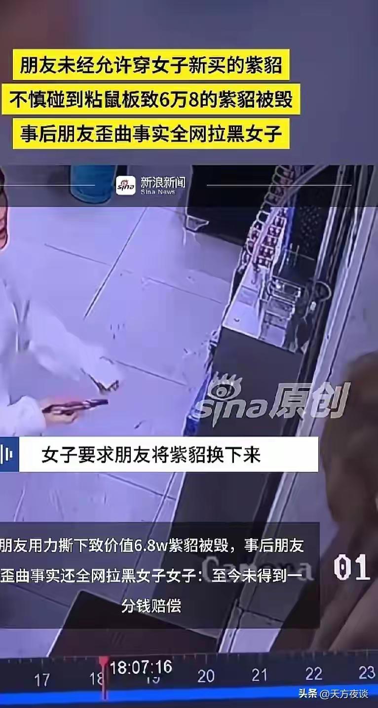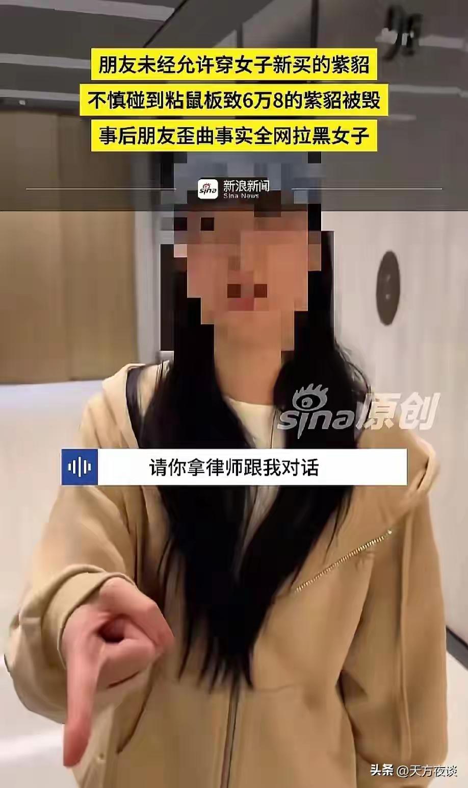 浙江闺蜜强穿6.8万紫貂大衣当场毁坏!拉黑失联后嚣张放话:有本事让律师来找我!
