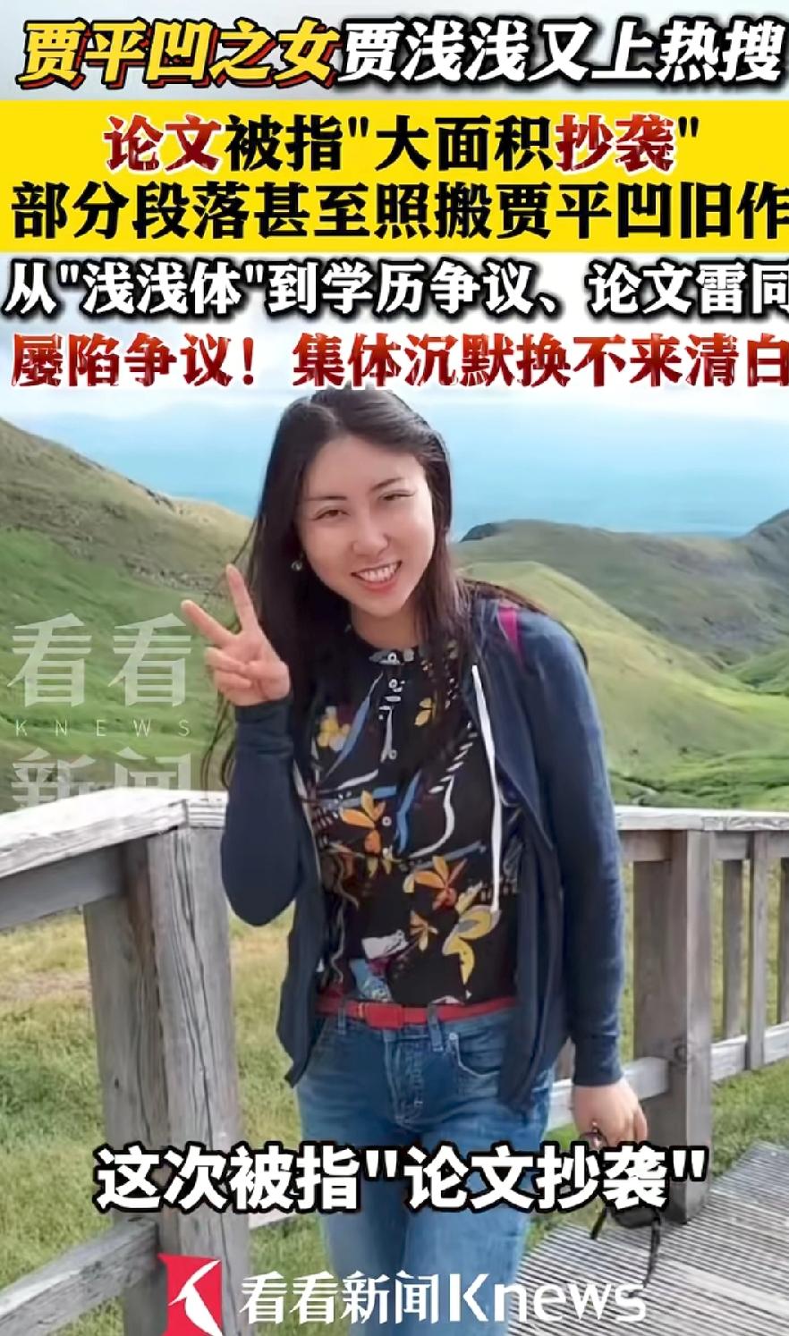 贾浅浅,又上热搜了!多年前多篇论文被举报涉嫌抄袭,还有竟然是抄别人,研究自己父亲贾平凹艺术作品的论文,在贾平凹杂志上发表,疑似学术权利寻租!目前贾浅浅本人,以及所任职的西北大学,均没有回应,沉默时间太长,就意味着心虚默认了!四、五年前,因为屎尿体诗上热搜被热议,成为网络梗至今被吐槽,如今又被别人盯上了!到底如何收场,关注后续!