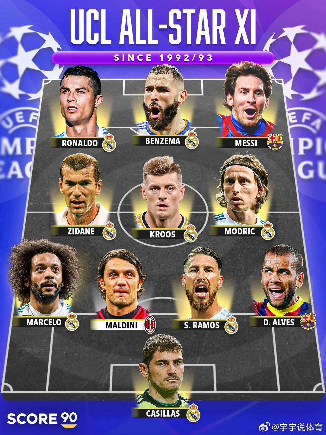 Score90近日评出1992/93赛季以来的欧冠历史最佳阵容,最终入围的11人中,皇马与巴萨球员占据10席,只有马尔蒂尼一人并非来自这两家西甲豪门。