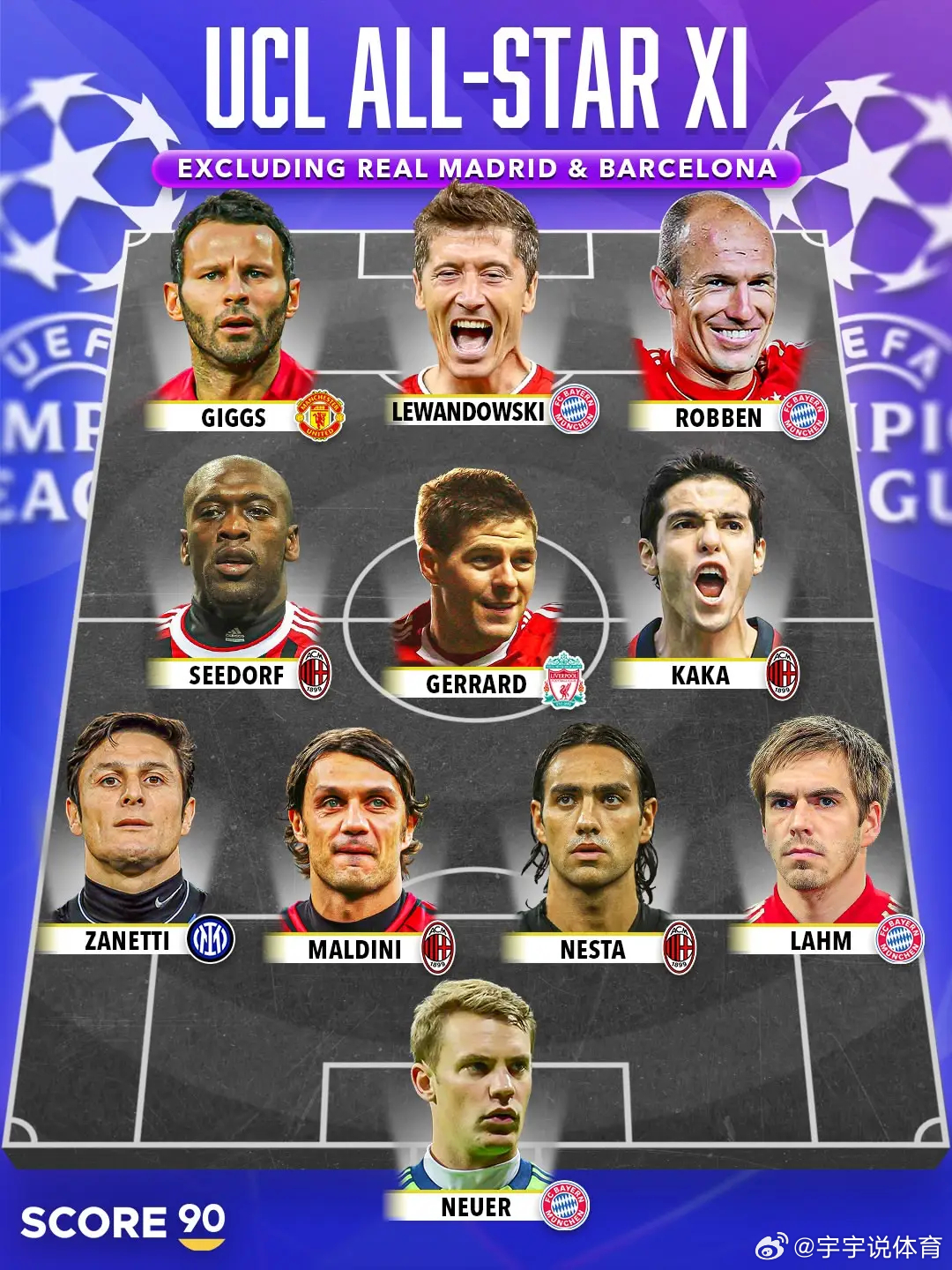 以及排除皇马和巴萨球员之后的欧冠11人最佳阵容,具体名单为:前锋:吉格斯、莱万多夫斯基、罗本;中场:西多夫、杰拉德、卡卡;后卫:萨内蒂、马尔蒂尼、内斯塔、拉姆;门将:诺伊尔