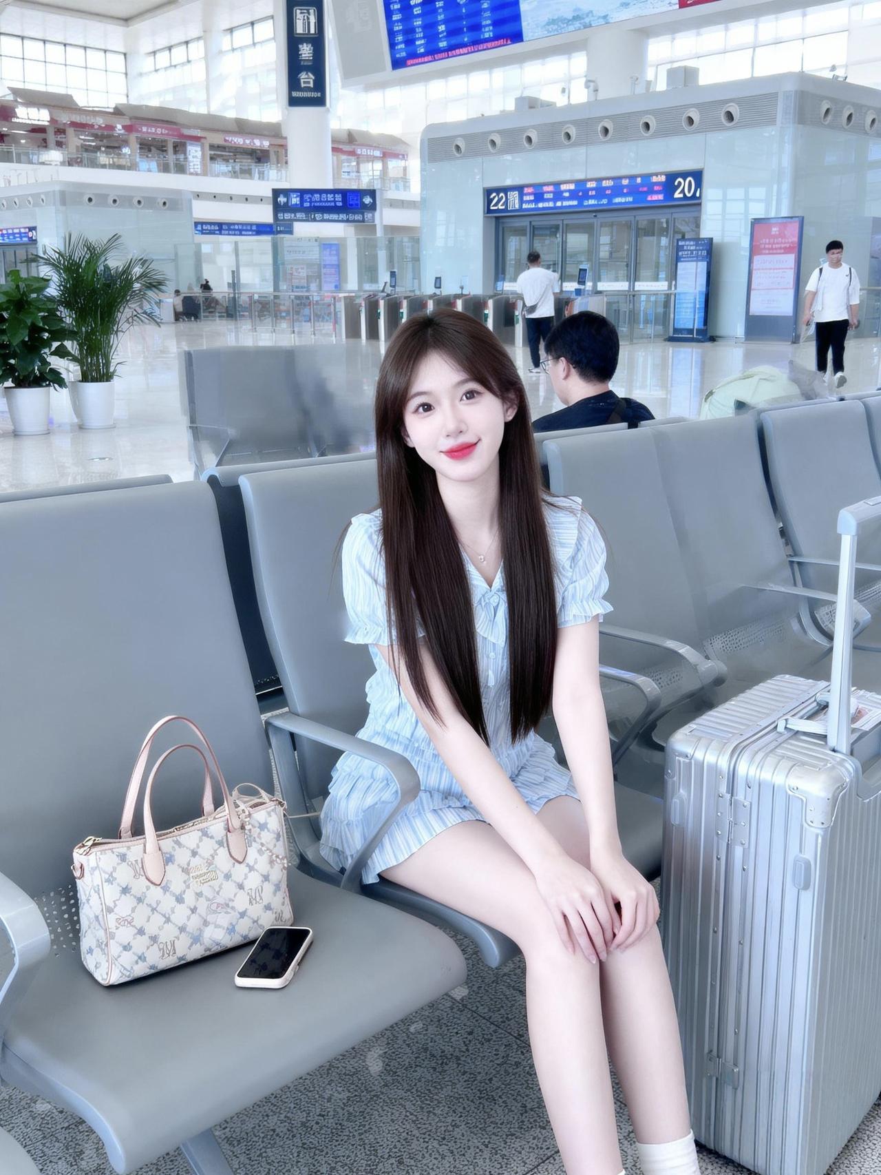 机场候机室的甜美少女,行李相伴,静待航班