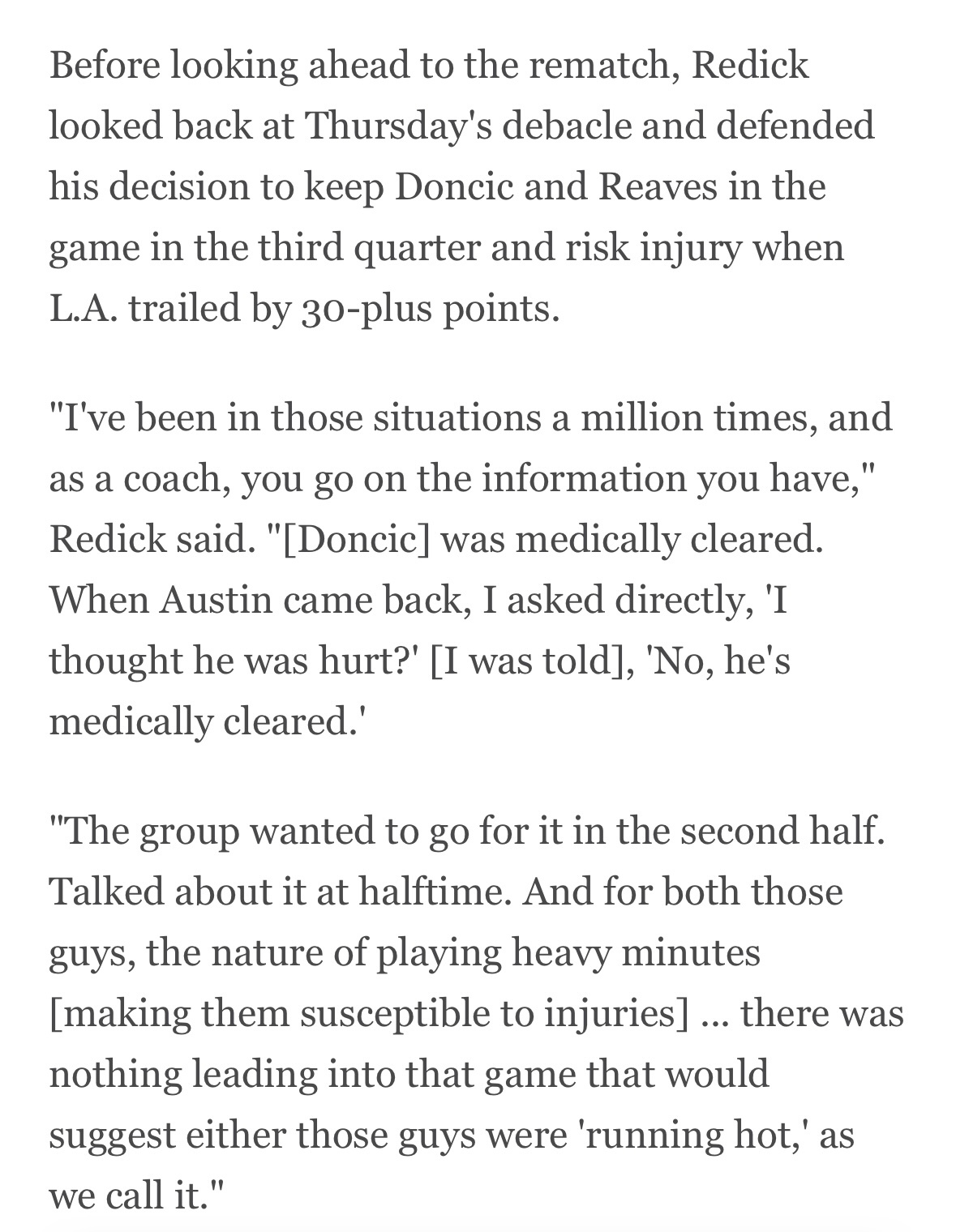 推卸责任? 雷迪克回顾了周四(对阵雷霆)的惨败,并为自己在湖人落后30+分时、仍让东契奇和里夫斯继续出战第三节、冒受伤风险的决定做出辩护:
