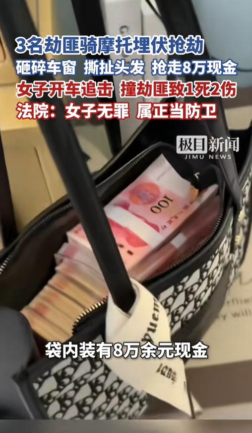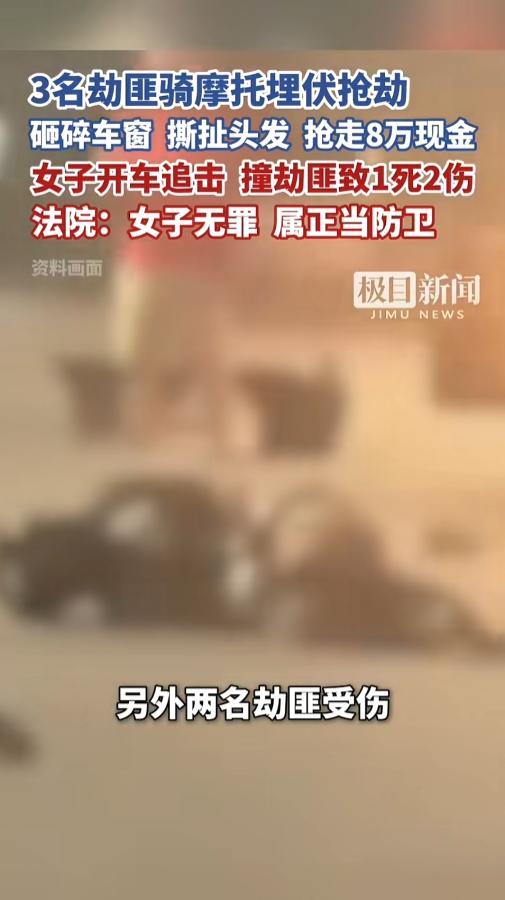“大快人心!”广东佛山,一女子准备开车离开地库时,突然冲出三个骑摩托车的劫匪,他们手持铁棍,砸碎了车窗,抢走了8万多现金。女子情急之下开车追赶,却不想撞上了劫匪的摩托车,造成一死二伤!法院:正当防卫! 自己被偷了,结果追小偷时,小偷受了伤,反而自己要赔偿,甚至坐牢,这样的案例发生了也不是一起两起了,让大家对正义也产生了怀疑,对方受点伤就防卫过当了? 据媒体报道,事发当日,荣女士遭遇了劫匪的埋伏,在她要开车离开车库时,三名劫匪骑摩托车冲了出来。他们手拿铁棍,一人抓住荣女士,撕扯她的头发,另一人砸碎了副驾车窗,抢走了一个手提袋,里面放着8万多现金。 手提包被抢走后,劫匪骑着摩托车,扬长而去。好在荣女士迅速反应,当即发动车子,追了上去。结果追了有一百米,荣女士的车子,就把劫匪的摩托车给撞了,其中一名劫匪当场身亡,另外两名劫匪也受了伤。 事后,荣女士说,她只是想把劫匪的车撞倒,拿回自己被抢的财物,并没有伤人的打算。案件审理期间,也一直配合工作。 法院经审理认为,劫匪并未脱离荣女士视野,抢劫活动仍在进行中,因此认定荣女士为正当防卫,不需要承担刑事责任。劫匪不服,提起上诉,终审将其驳回,维持了原判! 网友看后表示,判的好,法不能向不法让步!这才是人民想要的公平公正!给这位法官点一个赞! 信息来源:《3名劫匪骑摩托埋伏抢劫,砸碎车窗,撕扯头发,抢走8万现金,女子开车追击,撞劫匪致1死2伤,法院:女子无罪,属正当防卫》极目新闻
