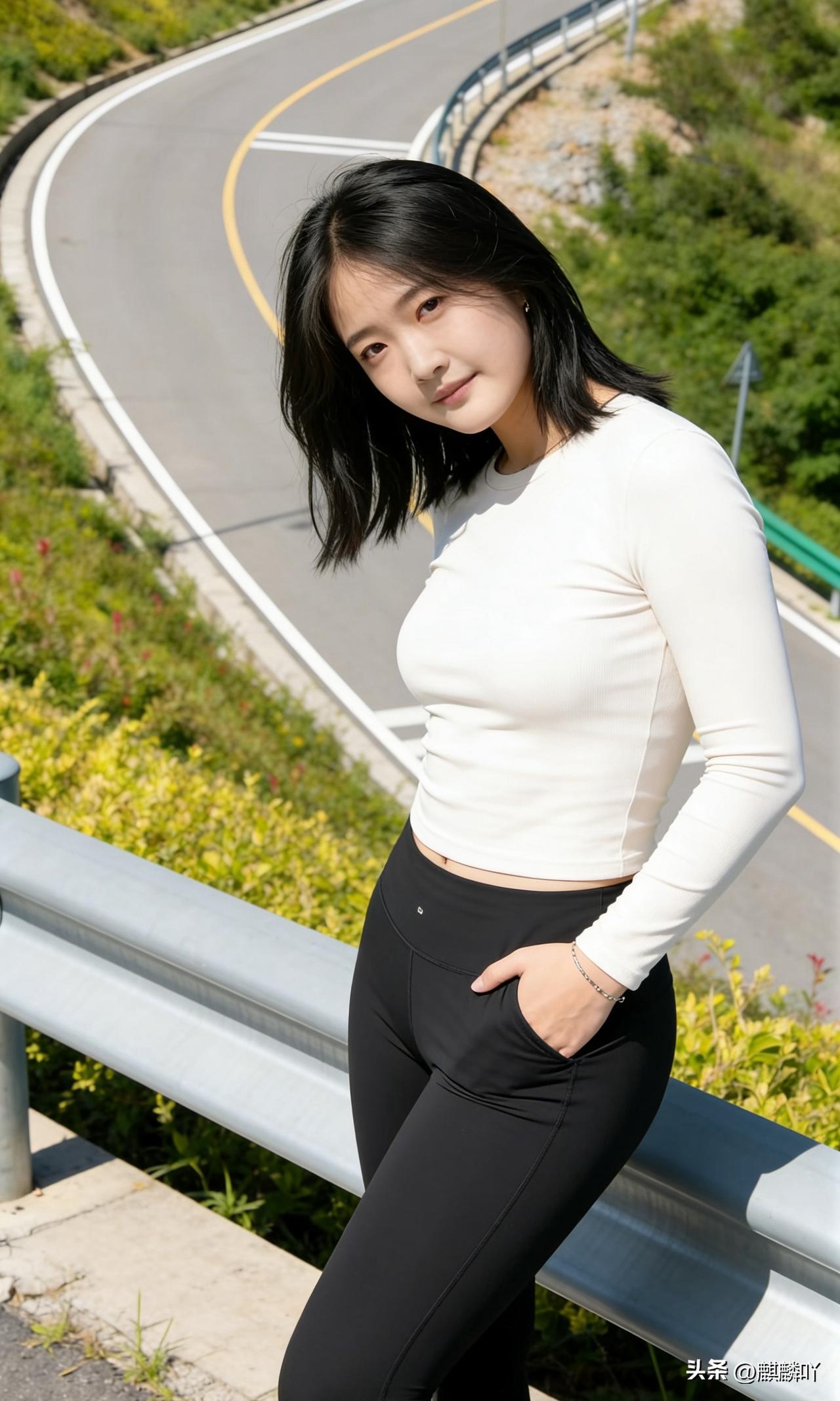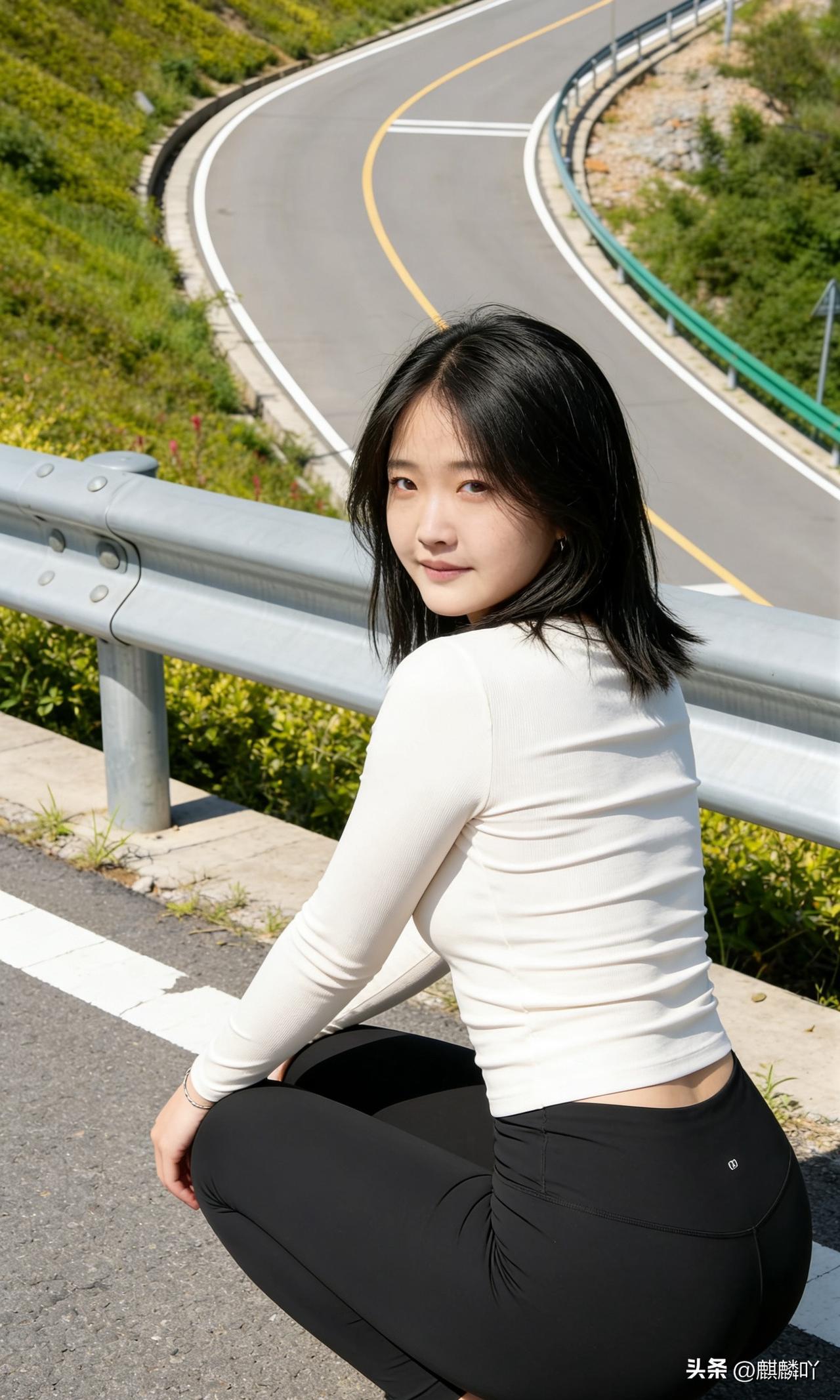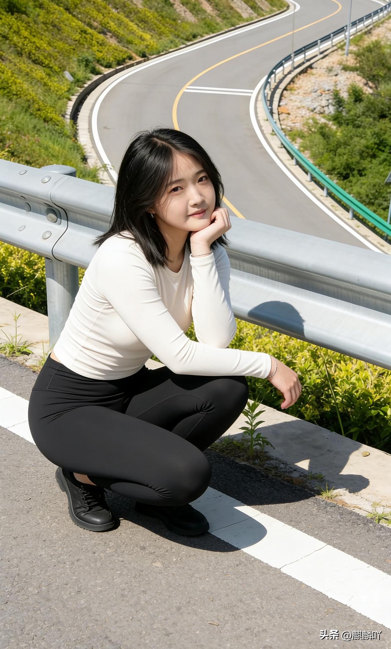 阳光下的公路风景,少女倚栏微笑,青春洋溢!🌞😊