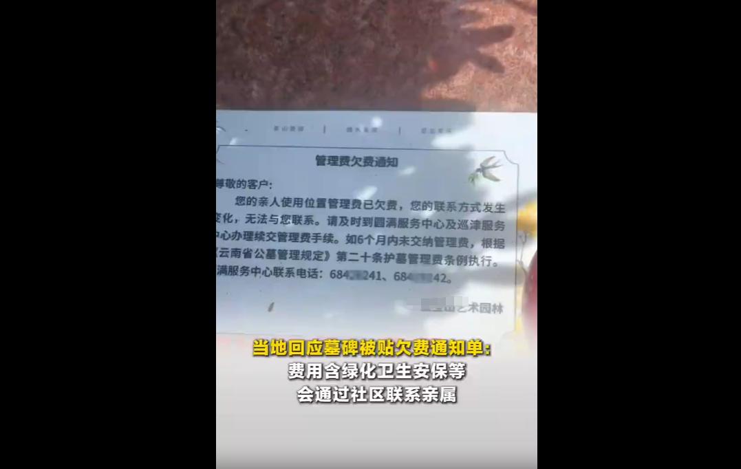 清明期间,云南一网友上坟时发现祖坟墓碑被昆明金宝山艺术园林贴了无公章欠费通知单,称6个月未缴管理费将按规定执行。 园方回应,管理费含绿化等项目,张贴系因联系不上家属,网友对无人缴费等情形提出疑问,园方未明确答复。 墓碑上的欠费通知,看似是公墓管理的常规操作,却也折射出公墓管理中规范与温度的平衡问题,既让人理解园方的管理难处,也能体会网友与逝者家属的复杂心情。 那些管理费,涵盖了绿化、卫生、安保等多个项目,这些服务的开展离不开资金支撑,按时缴纳管理费,也是维持公墓正常运转的基础。 不过,园方的做法也存在可优化之处。 清明时节,家属怀着悲痛的心情前来祭扫,却在墓碑上看到冰冷的欠费通知单,难免会感到不适;且通知单未加盖公章,也容易让家属和网友对其合法性、规范性产生质疑。 不少人坦言,还是觉得死后葬在老家的土地里更好,没有管理费的牵绊,时间久了,便与脚下的土地慢慢融合在一起,归于自然,这也是对逝者最质朴的告慰。 公墓不仅是逝者安息的场所,更是生者寄托思念的载体,管理过程中,既要坚守规范,保障正常运转,也要兼顾人文温度,避免伤害家属情感。 清明寄哀思,管理显温情。 无论是公墓安葬,还是归葬老家土地,核心都是让逝者安息、让生者安心,有人偏爱公墓的整洁规范,也有人眷恋老家土地的质朴自然,期待与土地融为一体、归于本真。