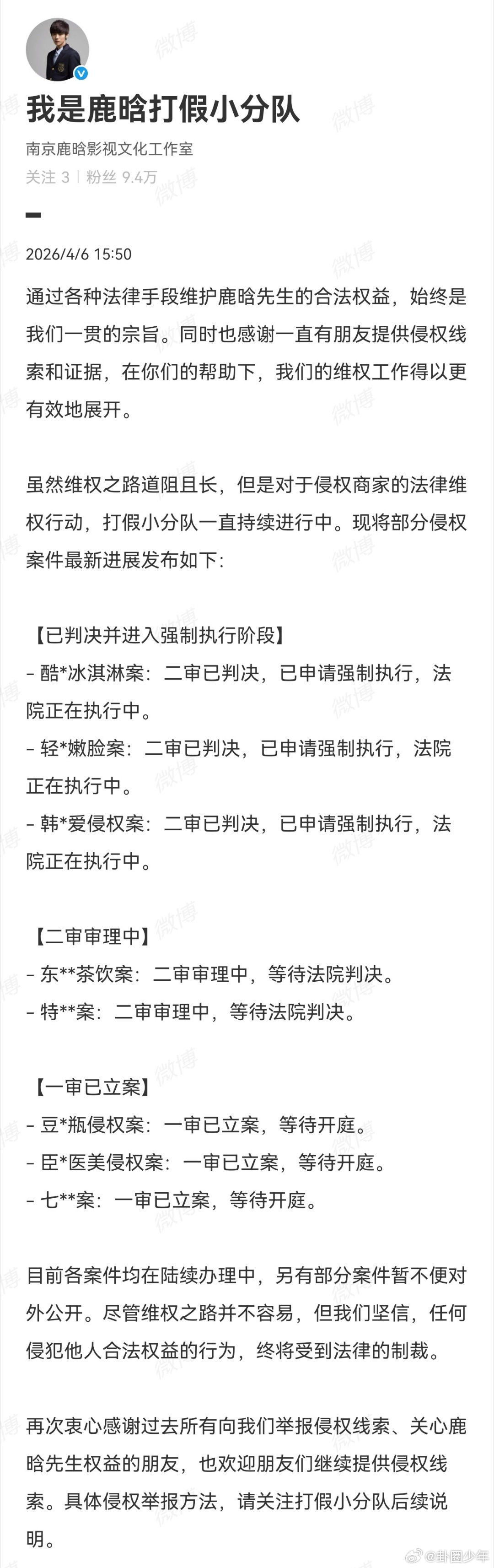 鹿晗告黑进度维权之路稳步推进,拒绝网络暴力与恶意造谣,为鹿晗的勇敢发声与理性维权点赞!