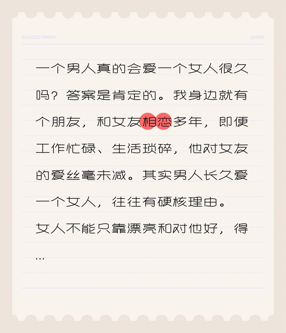 一个男人真的会爱一个女人很久吗?答案是肯定的。我身边就有个朋友,和女友相恋多年,即便工作忙碌、生活琐碎,他对女友的爱丝毫未减。