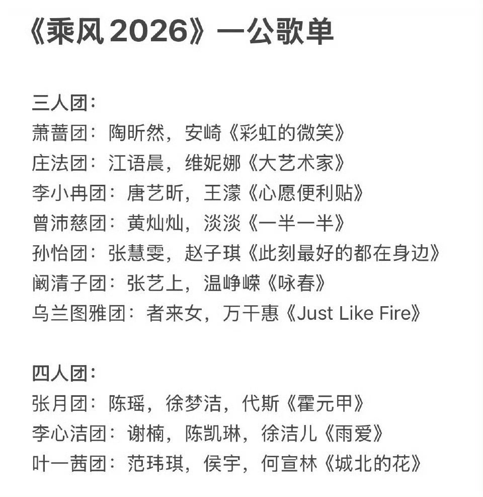 萧蔷团一公选曲彩虹的微笑萧蔷、陶昕然、安崎这组选《彩虹的微笑》,温柔姐姐+元气唱跳ace,已经开始期待一公舞台现场啦~乘风2026