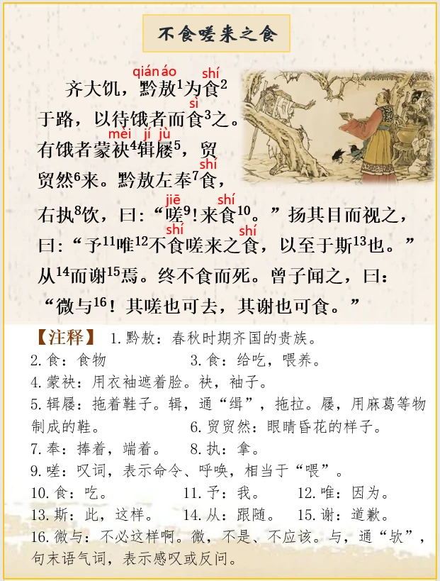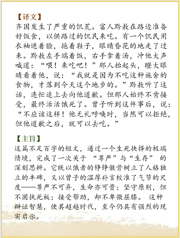 齐国发生了严重的饥荒。富人黔敖在路边准备好饭食,以供路过的饥民来吃。有一个饥民用衣袖遮着脸,拖着鞋子,眼睛昏花的地走了过来。黔敖左手端着饭,右手拿着汤,冲他大声喊道:“喂!来吃吧!”那人抬起头,瞪大眼睛看着他,说:“我就是因为不吃这种施舍的食物,才落到今天这个地步的。”黔敖听了这话,连忙追上去向他道歉。但那人始终不肯接受,最终活活饿死了。曾子听到这件事后,说:“不应该这样!他无礼呼唤时,当然可以拒绝,但他道歉之后,就可以去吃。”