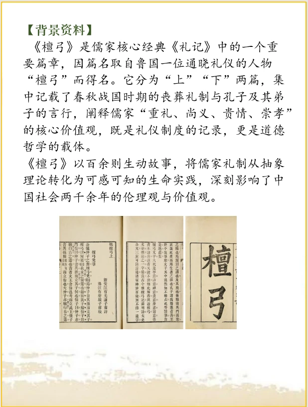 《檀弓》是儒家核心经典《礼记》中的一个重要篇章,因篇名取自鲁国一位通晓礼仪的人物“檀弓”而得名。它分为“上”“下”两篇,集中记载了春秋战国时期的丧葬礼制与孔子及其弟子的言行,它以百余则生动故事,将儒家礼制从抽象理论转化为可感可知的生命实践,深刻影响了中国社会两千余年的伦理观与价值观。