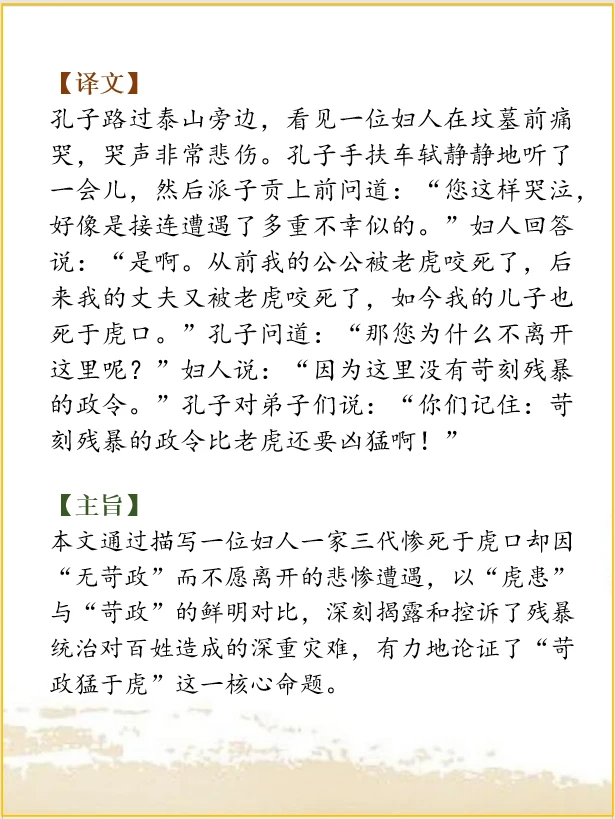 孔子路过泰山旁边,看见一位妇人在坟墓前痛哭,哭声非常悲伤。孔子手扶车轼静静地听了一会儿,然后派子贡上前问道:“您这样哭泣,好像是接连遭遇了多重不幸似的。”妇人回答说:“是啊。从前我的公公被老虎咬死了,后来我的丈夫又被老虎咬死了,如今我的儿子也死于虎口。”孔子问道:“那您为什么不离开这里呢?”妇人说:“因为这里没有苛刻残暴的政令。”孔子对弟子们说:“你们记住:苛刻残暴的政令比老虎还要凶猛啊!”