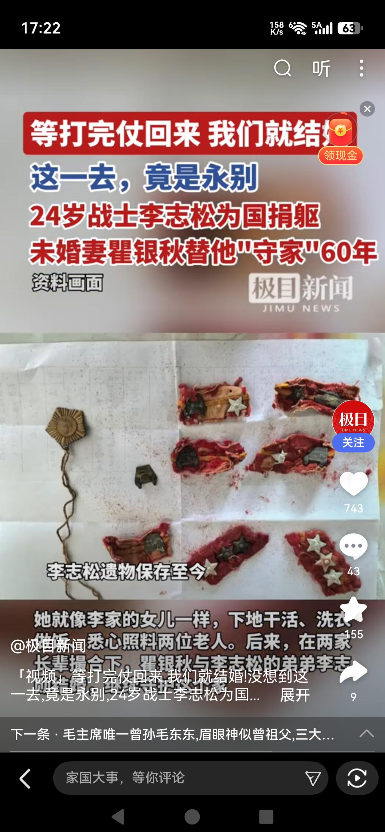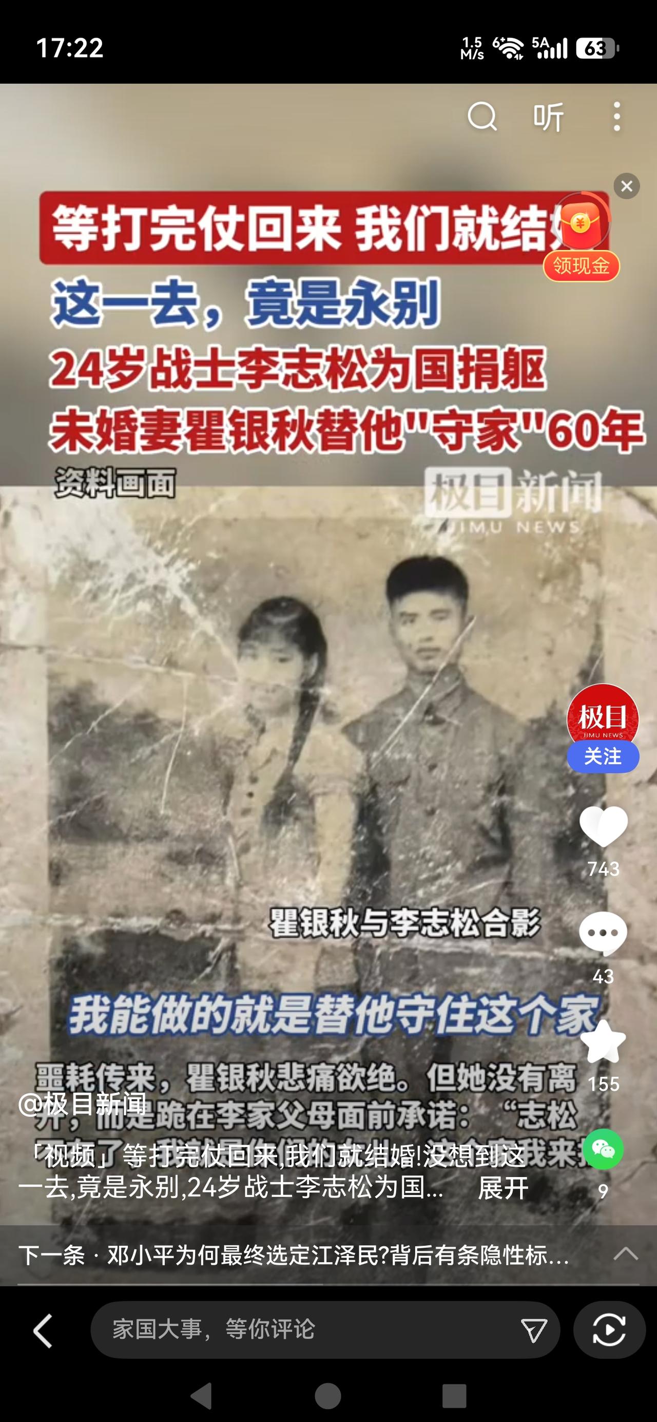 60年的坚守,这份爱比任何誓言都重 24岁的英雄李志松执行任务牺牲,未婚妻瞿银秋年仅22岁,她拒绝改嫁、跪地认亲,以女儿身份撑起烈士家庭,照料公婆、抚育弟妹,一守就是60年。这不是一时冲动,是刻在骨子里的信义与深情,用一生兑现承诺,替英雄尽孝守家,彰显平凡人最厚重的家国情怀与人性光辉,也让我们看见坚守与担当的真正模样。 看完这个故事,瞬间破防。22岁的姑娘,本该身披嫁衣、奔赴幸福,却在最好的年纪,选择用一生去守护一个没有新郎的家。 多少人劝她改嫁,开始新生活,可她跪在老人面前一句“我就是你们女儿,这个家我来扛”,道尽了最纯粹的情义。她放下青春与情爱,下地劳作、操持家务,把破碎的家一点点撑起来,让英雄的父母老有所依,让家族得以延续。 有人说她太傻,可这世上最珍贵的,从来不是权衡利弊的精明,而是义无反顾的赤诚。英雄为国捐躯,她为英雄守家,一守就是一甲子。青丝变白发,初心从未改,这不是封建执念,是中国人刻在骨子里的信义、善良与担当。 在快节奏的今天,爱情常被快餐化,承诺变得轻飘飘,而她用60年告诉我们:真正的深情,是生死不负;真正的信义,是一诺千金。 向这位平凡又伟大的老人致敬,她守的不仅是一个家,更是人间最珍贵的情义。