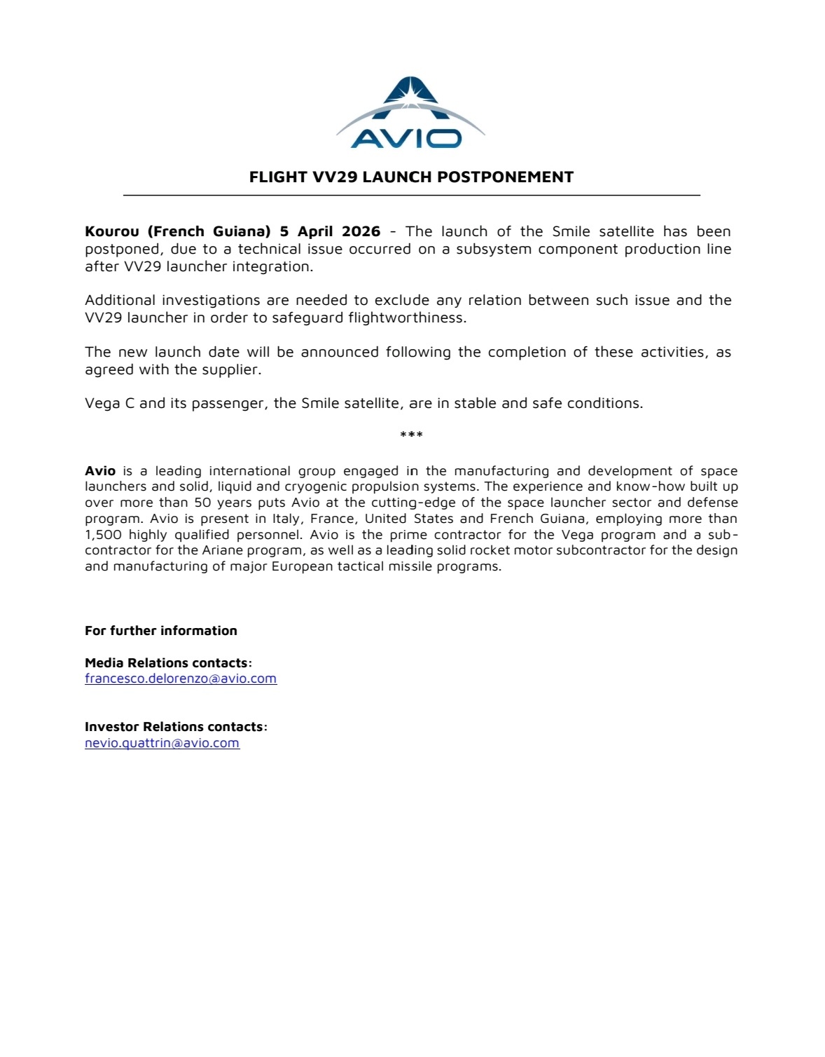 Vega系列运载火箭的研制及运营商意大利Avio公司刚刚发布通知,由于Vega-C运载火箭相关子系统生产测试出现问题,举一反三,导致即将于3天后执行VV29任务(中法合作SMILE卫星发射任务)推迟,具体时间待定