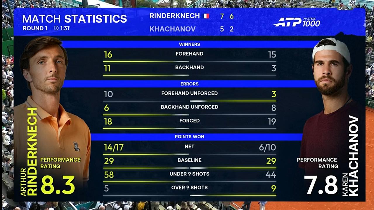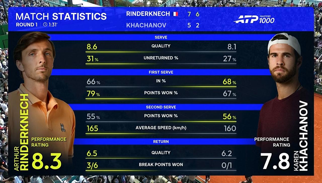 北京时间2026年4月6日下午,蒙特卡洛大师赛第一轮,表哥林德克内希对阵卡恰洛夫。
