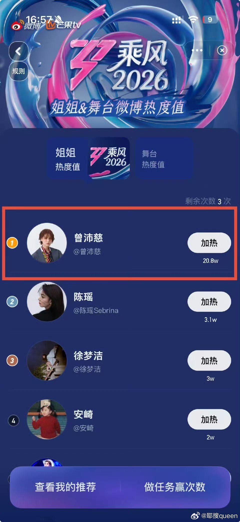 曾沛慈热度值破20万终极女孩集合!曾沛慈初舞台杀疯了,一首《一个人想着一个人》热度值直接破20万断层登顶。开口就是青春回忆,歌声温柔又有力量,实力与情怀兼备,姐姐值得更多掌声与偏爱!曾沛慈 断层第一乘风2026