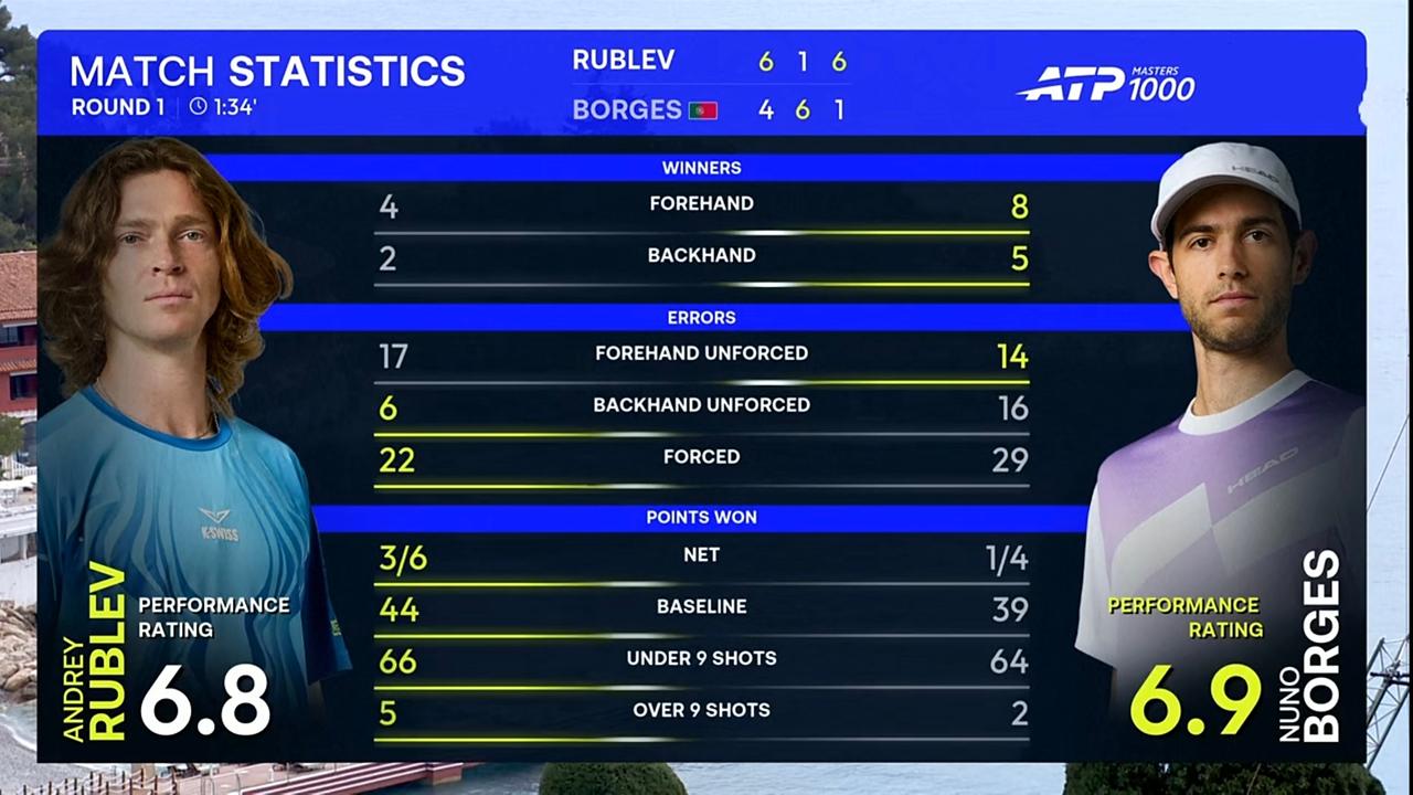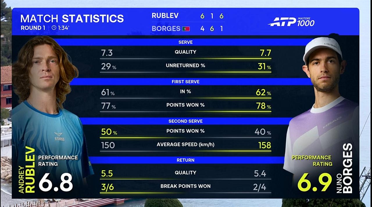 卢布列夫蒙特卡洛大师赛与博尔热斯互送油条 北京时间2026年4月6日下午,蒙特卡洛大师赛第一轮,卢布列夫与博尔热斯隔网相对。 这场比赛大波大折,卢布列夫与博尔热斯互送油条。最终,卢布列夫以2:1的比分击败博尔热斯,成功晋级。 具体比分为6:5、1:6、6:1。 整场比赛,卢布列夫共轰出4记ACE,比对手少1记;发出3个双误,比对手多1个;一发得分率76.74%,比对手低1个多百分点;二发得分率50.00%,比对手高出10个多百分点;共拿到6个破发点,比对手多2个;成功破发3次,比对手多1次;总得分71分,比对手多5分。
