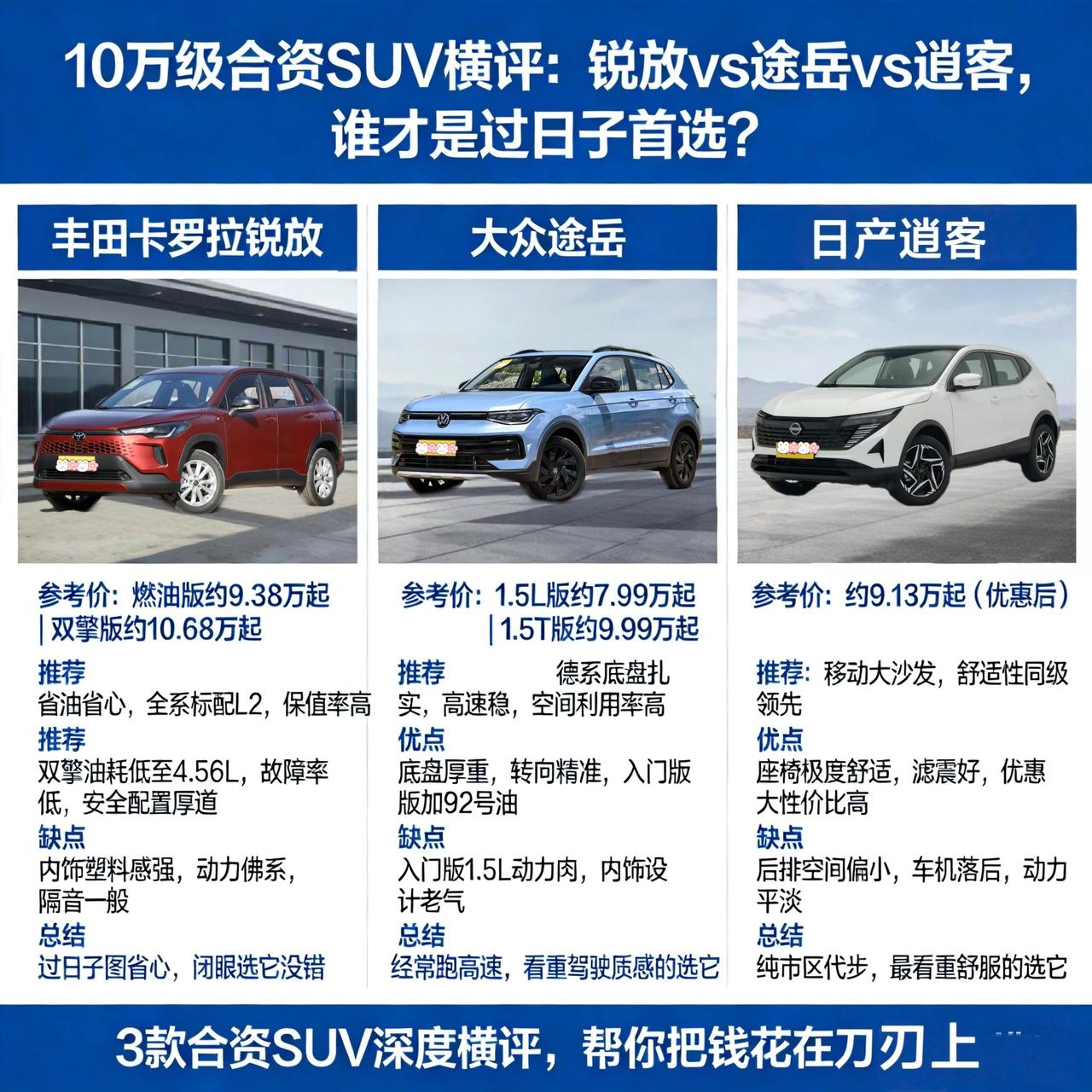 丰田卡罗拉锐放、大众途岳、日产逍客,看看谁最适合咱们普通家庭 兄弟们,最近有朋友问我:预算10万出头,想买台合资SUV,主要就是上下班代步、周末带老婆孩子出去转转,要省油、要省心、最好还有点面子。我一听,这不就是典型的“过日子型”选车需求嘛。 这个价位段,合资紧凑型SUV打得正凶。今天咱们就唠三款——丰田卡罗拉锐放、大众途岳、日产逍客,看看谁最适合咱们普通家庭。 👉丰田卡罗拉锐放——省油省心的“佛系暖男” 这车啥调性? 如果你是个怕麻烦的人,不想动不动就往修理厂跑,那锐放绝对是首选。丰田的品控,懂的都懂,主打一个“开不坏”。 亮点在哪儿? 第一肯定是省油。特别是它的智能电混双擎版,2.0L的排量,百公里油耗才4.56L左右。加一箱油能跑大几百公里,别人往加油站跑两趟,你跑一趟,时间久了真能省出一笔钱。 第二是安全配置不玩虚的。这车哪怕是最低配,也给你配了L2级辅助驾驶,全速自适应巡航、主动刹车都有,跑高速能轻松不少。 第三是科技感有提升。2026款外观更时尚,高配车型提供了12.9英寸的大屏,并使用了8155芯片,车机流畅度比老款强不少。 槽点也得说 别指望它有啥推背感,动力就是平顺、够用,急加速的时候发动机噪音会有点大。另外,内饰的塑料感依然存在,低配版的织物座椅和卤素大灯,在用料上确实不如同价位的国产车大方。 适合谁? 如果你就是纯代步,图个省心、省钱、保值,闭眼入锐放。特别是每年开得多的朋友,混动版多花的钱很快能从油费里省回来。 👉大众途岳——底盘扎实的“德系硬汉” 这车啥调性? 途岳开起来的感觉,跟日系车完全不一样。大众的车,底盘就是整,跑高速稳得像粘在地上一样,心里特有底。 亮点在哪儿? 德系质感是它最大的卖点。方向盘指向精准,底盘过减速带“咚咚”两声就过去了,不拖泥带水,坐着不晕车。 空间利用率高。别看它车身长度可能不如锐放,但后备箱规整,后排坐垫长度也够,对大腿支撑好,坐长途没那么累。 外观显大。大众的设计语言就是横平竖直,看着比实际尺寸要大气,开回老家也不丢面儿。 槽点也得说 10万出头的预算,主要能买到 1.5L自然吸气版本,110匹马力,市区代步够用,但追求推背感就别想了,动力主打一个平顺可靠。好在它不挑食,推荐加注92号汽油,日常使用成本比较友好。 适合谁? 如果你经常跑高速、跑国道,或者就是喜欢那种厚重的驾驶感,并且能接受入门版相对温和的动力表现,那途岳会是个让你开起来很安心的选择。 👉日产逍客——移动的“大沙发” 逍客在江湖上混了这么多年,靠的就是两个字——舒服。特别是它的座椅,坐上去就像家里的沙发一样,特别软乎。 亮点在哪儿? 舒适性天花板。悬挂调校软,过坑洼路面晃晃悠悠的,滤震很好。后排座椅角度也合适,带老人孩子出门,他们不遭罪。 通过性还行。逍客的离地间隙比一般轿车高不少,偶尔上个马路牙子、走走烂路,不用担心磕底盘。 价格是杀手锏。虽然技术不算最新,但终端优惠大,入门门槛是三款中最低的,性价比突出。 槽点也得说 逍客的缺点也比较明显:空间在同级里算小的,后排坐三个人会有点挤。另外,车机系统的智能化体验,相比锐放这类搭载新芯片的车型,流畅度和功能丰富度上确实有差距。CVT变速箱强调平顺省油,但不太适合激烈驾驶。 适合谁? 如果你买车最看重的是座椅舒不舒服、底盘颠不颠,对动力和科技配置要求不高,就想舒舒服服从A点到B点,那逍客还是很香的。 ✍️总结建议,直接照着买 怎么选?我给大家画个重点: 👉闭眼选:丰田卡罗拉锐放 如果你实在纠结不知道买啥,就选它。它是三款里最均衡、最省心的,没有明显短板。特别是混动版,虽然贵一点,但长期持有成本最低,开几年卖二手也亏不了多少。 👉跑高速多:大众途岳 如果你的通勤路况以高架、国道、高速为主,那必须选途岳。德系底盘的稳当是日系车给不了的,那种贴地飞行的安全感,长途驾驶能减少不少疲劳感。 👉纯代步买菜:日产逍客 如果你就市区里转转,接送孩子买个菜,时速不超过60,逍客的舒适和省油就很合适,价格也是三款里最亲民的。 ✍️最后说句大实话:这个价位没有完美的车,只有最适合你钱包和脚丫子的车。建议周末带着家人去试驾,让老婆孩子坐后排感受一下,谁坐着不晕车、谁开着你最放松,就选谁! (本文基于2026年4月市场行情,具体价格及配置请以当地经销商实车为准,驾驶感受等主观体验建议实际试驾。)【来自懂车帝车友圈】
