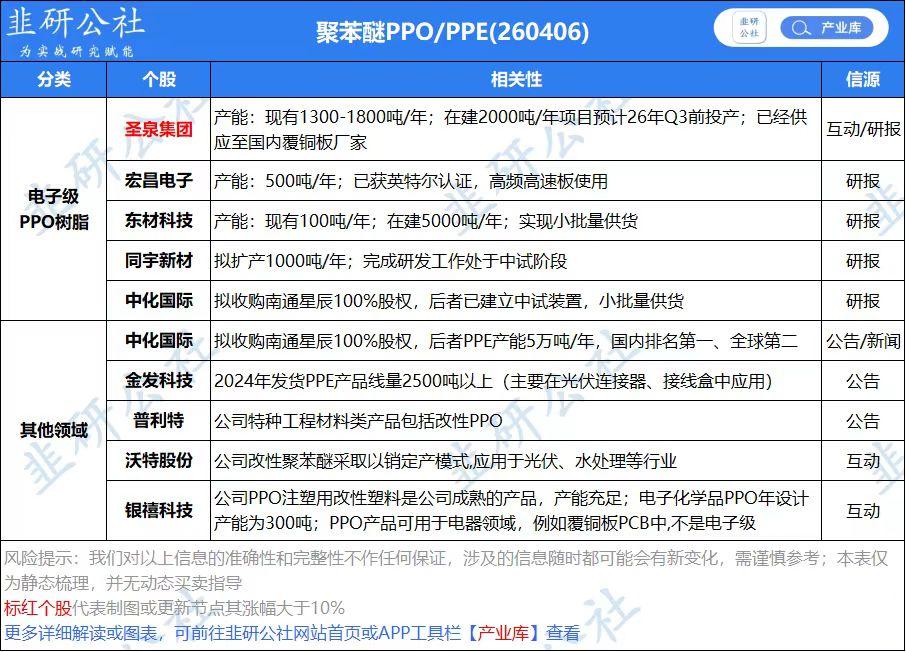 4.3号周五盘后,建滔积层板年内第2次涨价,加上去年的: 他分别在 25年2月,每张上调10元人民币 25年8月,每张上调10元人民币 25年12月,全面上调10% 3月10日,全面上调10% 4月3日,统一上调10% 不到一个月内又一次调价,主因上游铜箔、玻纤布、环氧树脂等三大主要原材料成本持续上涨,而这次的重点,是树脂。 PPO/PPE,一种高频高速树脂材料,4月起每月提价幅度不低于5%。 环氧树脂,受中东局势影响,较冲突爆发以来已上涨约40%。 环氧树脂可以理解为普通树脂,PPO/PPE则是高端树脂,全球市场由沙比克(SABIC) 和日本三菱瓦斯主导,合计占据近80%。 国内: ①圣泉集团(已有1300吨/年产能并稳定供货) ②东材科技(现具备100吨/年产能,规划5000吨/年,在建中) 但要注意节奏,如果利好高开不能封板,是兑现时机,没有利好‘消息’的时候其实也在涨价,其实才是布局时机。