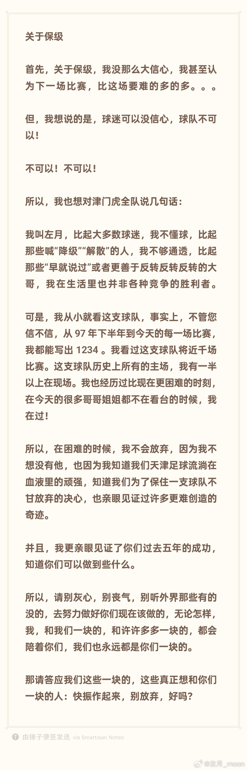 要是我一个不懂球、没见地、没多大出息的球迷姐姐尚能愿意陪球队走下去,也愿意以一切方式帮助到球队,那球队的各位大老爷们们还有什么理由不振作起来呢?那热爱天津足球的掰掰们,大哥们还有什么理由不振作起来呢?