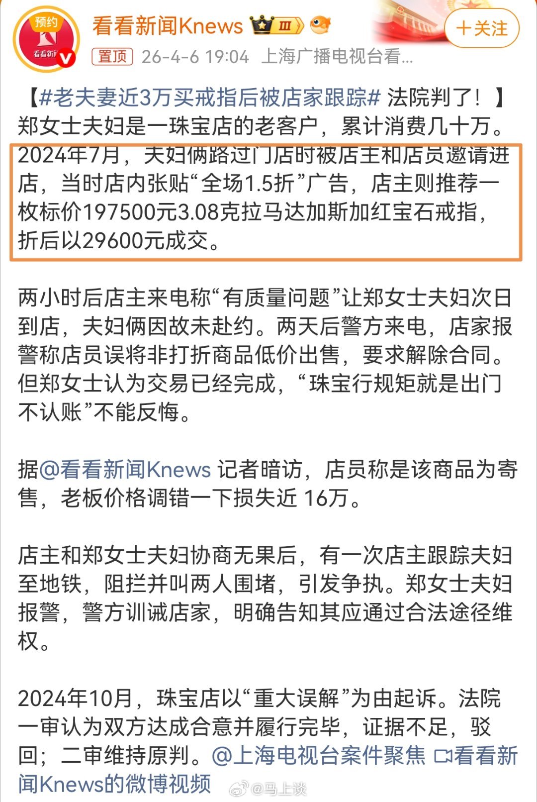老夫妻近3万买戒指后被店家跟踪哈哈看了描述,不会是把真珠宝打折卖了吧?事情经过: