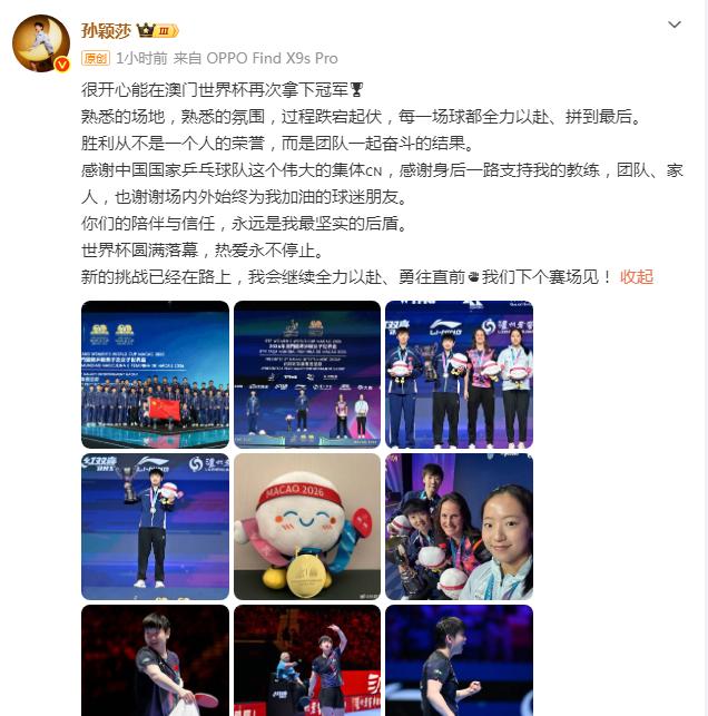 孙颖莎说胜利是团队奋斗的结果,新的挑战已在路上! 4月5日晚,澳门国际乒联单打世界杯女单决赛,孙颖莎大比分4比1战胜队友王曼昱,成就了史无前例的单打世界杯女单三连冠。4月6日,孙颖莎在社交媒体发文表示,很开心能再次拿下冠军,自己的每一场球都全力以赴、拼到最后。 国际乒联官网发文,孙颖莎创造历史。在澳门实现世界杯女单三连冠,配图是孙颖莎“比3”的图片。文章写道:“孙颖莎完成了乒乓球史上前无古人的壮举。这位世界排名第一的选手在澳门单打世界杯女单决赛中,以4比1战胜队友王曼昱,夺得史无前例的世界杯女单三连冠。她成为继樊振东之后,世界杯历史上第二位实现单打三连冠的选手——樊振东曾在2018、2019和2020年达成这一成就。” 6日,孙颖莎在社交媒体发文并回顾了本届世界杯的征程。她写道:“很开心能在澳门世界杯再次拿下冠军。熟悉的场地,熟悉的氛围,过程跌宕起伏,每一场球都全力以赴、拼到最后。胜利从不是一个人的荣誉,而是团队一起奋斗的结果。感谢中国国家乒乓球队这个伟大的集体,感谢身后一路支持我的教练,团队、家人,也谢谢场内外始终为我加油的球迷朋友。你们的陪伴与信任,永远是我最坚实的后盾。” 展望未来,孙颖莎写道:“世界杯圆满落幕,热爱永不停止。新的挑战已经在路上,我会继续全力以赴、勇往直前,我们下个赛场见!” 文/北青体育 周学帅