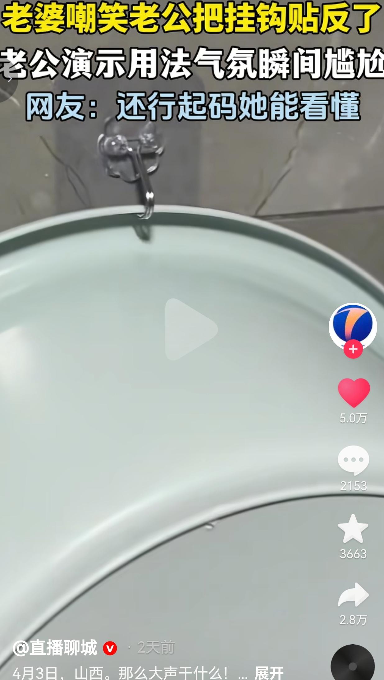 笑到肚子疼!山西一对小夫妻,就因为一个粘钩,把全网网友笑疯了!老婆笑老公把挂钩贴反了,结果老公当场演示用法,尴尬到抠出三室一厅! 4月3日山西,这视频我刷到直接笑出眼泪! 老公在家贴强力粘钩,贴完美滋滋跟老婆显摆,结果老婆一看直接笑喷了:“你是不是傻?贴个挂钩都能贴反!这钩子朝里,能挂住个啥?” 老公不服气,脸涨得通红:“我让你笑我!”说着就拿起一个洗脸盆,“啪”一下就挂在了那个反着的挂钩上! 我滴个乖乖!那挂钩居然真的把盆给挂住了!老婆当场傻眼,嘴张得能塞个鸡蛋,刚才的嚣张劲儿瞬间没影,空气直接尴尬到凝固! 更绝的是,老婆自己演示,却做不出来,最后,还说自己明白了,原来是要把挂钩拆下来重新安装。 而老公看老婆智商着急,直接从老婆手机里拿了过来,亲自展示给老婆看。 老婆看到后,当场石化,委屈地说:“你说话小点声。” 网友笑疯了:“还行,起码她能看懂!”“这哪是贴反了,这是老公的智商反了!” 有网友说: 笑不活了!我以为是青铜,结果是王者!这反着的挂钩居然真能挂东西,我直接给老公跪了! 也有的网友说: 这不就是我家吗!我天天笑我老公干啥啥不行,结果每次都被他狠狠打脸!尴尬到我想找地缝钻! 还有的网友说: 老婆笑我贴反了?不存在的!我直接用实力说话!这就是男人的浪漫,你们不懂! 我真的笑到拍大腿!这哪是粘钩贴反了,这是老公给老婆上了一课! 多少夫妻在家,不就是这样吗?老婆天天嫌老公笨,嫌老公干啥啥不行,结果老公总能用意想不到的操作,狠狠打你的脸! 你以为他贴反了,结果他只是换了个用法;你以为他傻,结果他比谁都聪明! 这尴尬吗?太尴尬了!但这就是夫妻间最真实的样子啊! 没有谁比谁高明,没有谁比谁厉害,就是吵吵闹闹、互相嫌弃,却又在不经意间,给你一个大大的惊喜! 那些天天吐槽老公没用的女人,你们好好看看!男人的智慧,从来都不是用在贴挂钩上的! 别再天天骂老公傻了,说不定哪天,他就用一个反着的挂钩,给你整得明明白白! 这件事,从来都不是一个粘钩的对错,而是夫妻间最珍贵的烟火气。 我们总在婚姻里追求完美,追求对错,却忘了,最动人的,从来都是这些不完美的、尴尬的、好笑的瞬间。 老公的“反着贴”,不是笨,是生活的小智慧;老婆的嘲笑,不是嫌弃,是藏在心里的爱。 最好的婚姻,就是我敢笑你,你敢怼我,我们在吵吵闹闹里,把日子过成了笑话,也过成了诗。 最后,我想说的是:最好的婚姻,就是我敢笑你笨,你敢用实力让我闭嘴! 对此,你怎么看?