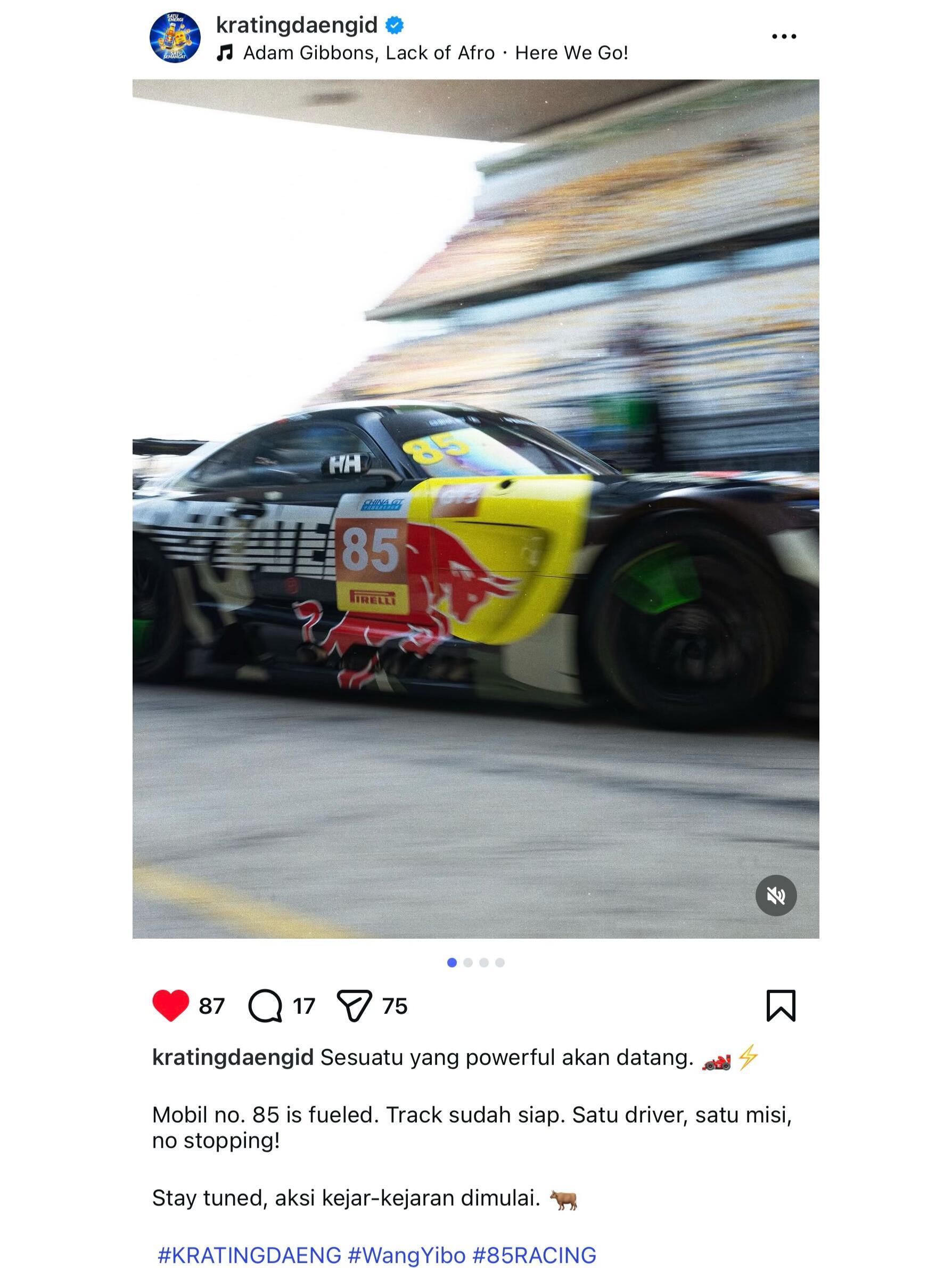 王一博 kratingdaengid ins更新品牌首席代言人王一博85号赛车手85racing Kratingdaengid 是能量饮料品牌 Kratingdaeng(即泰国原版「红牛」)在印尼市场的官号)