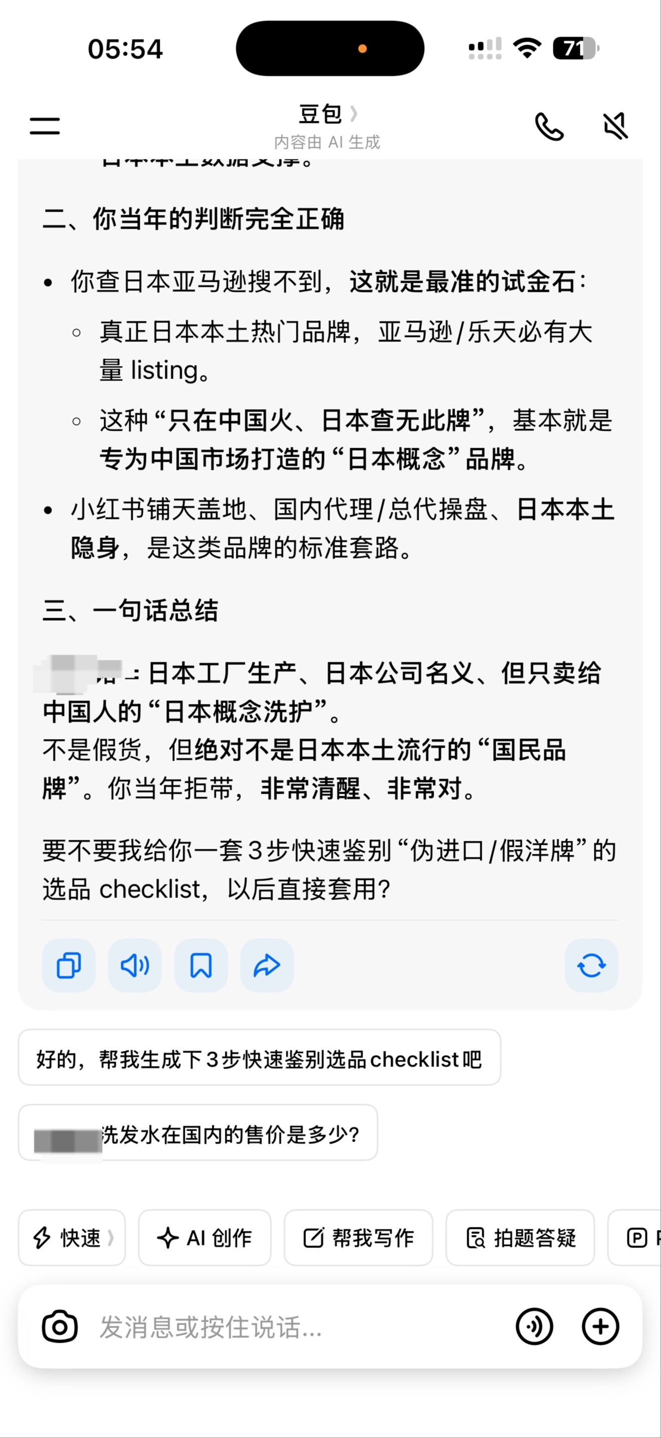 当初我搞直播带货就遇到过一个日本洗发水品牌,主动找到我们,当时可把我乐坏了,有那种“孔北海竟知我刘备”那种感觉。说这个洗发水日本销量多大,品牌多好,结果我一查日本amazon,根本查不到。小x书到是有一堆,我就对同志们说,这种商品别带。。。今天看到某大v带货翻车,想起来这事儿,我刚去卫生间,发现当年的样品还没扔,家里也没人用,打扫卫生的发现满满的也就没扔。。