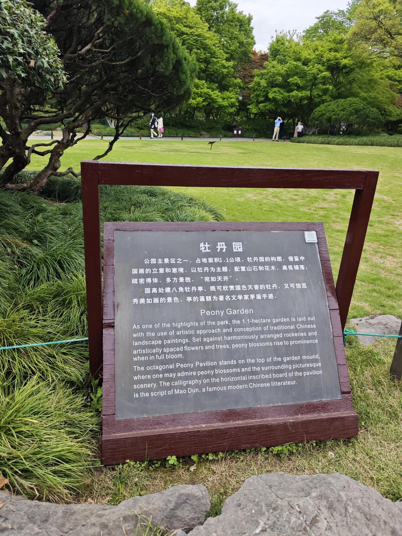 杭州西湖的春天美炸天,而西湖牡丹园更是惹人心醉,从虎跑路进入南山路不远处就是杭州十大风景之一花港观鱼。 苏堤游人如织,但是旁边的花港观鱼却是闹中取静,游人相对要少一些,是节假日休闲游玩的好去处。 现在刚好是牡丹开放的季节,姹紫嫣红的牡丹花竞相开放。抬眼望去山石、花草树木和修建的亭台楼阁,错落有致,处处都是美景。 这里还有著名文学家茅盾的手迹《牡丹亭》,看到这苍劲有力的字体让我不由自主的想起老先生的长篇小说《子夜》和短篇小说《林家铺子》等众多文学作品。
