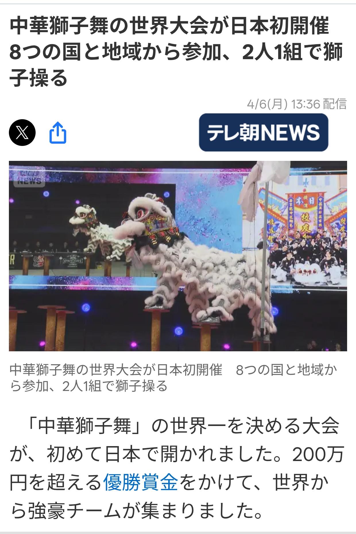 横滨举办中华舞狮国际大赛 日本《朝日新闻》4月6日“中华舞狮”大赛首次在日本举办。 奖金超过200万日元(约8.7万元人民币)。 来自世界各地的舞狮队齐聚一堂。每个组合由两人配合,活灵活现地通过眼睛和嘴巴展示舞狮的魅力。 代表日本参赛的是由横滨市公司职员長島伶翔(24岁)和大学生冯品超(22岁)领衔,他们将跳上铁柱子起舞。 两人组合已成立五年,这次他们的目标是赢得冠军。 这是日本举办的首个世界中华舞狮比赛。 前后协调和技术难度是关键。 柱子高度从1米到2.5米。 去年的国际赛事共有40支队伍参赛,长岛组合跻身前十名。 最终排名第七。