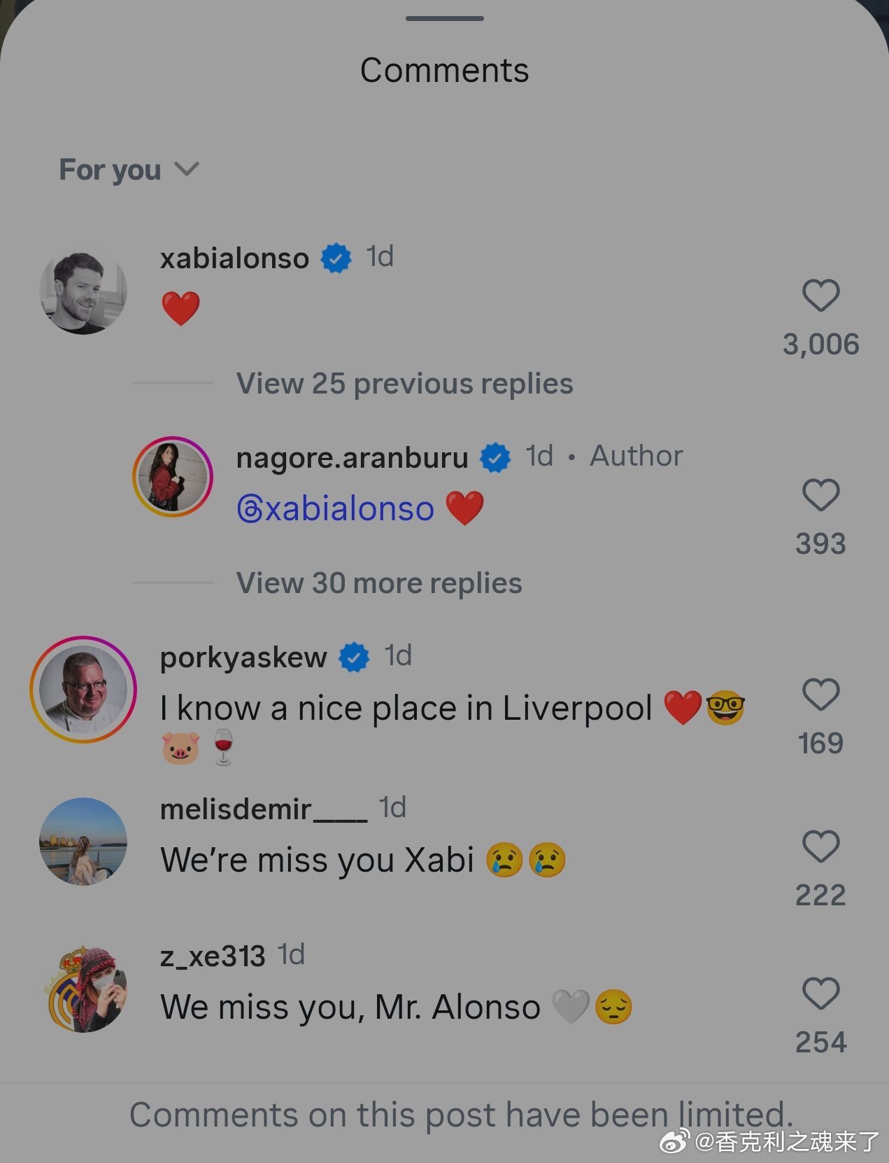 由于利物浦球迷不断评论,阿隆索的妻子不得不关闭她最近发布的帖子的评论功能